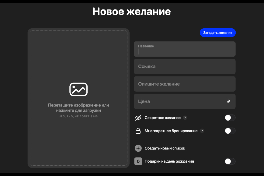 Этот сервис прямо предлагает пользователям помечтать: списки здесь называются «Мои желания», а чтобы создать карточку подарка, нужно нажать кнопку «Загадать желание».