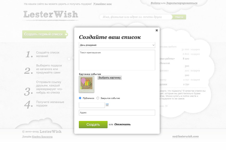 Простой в использовании сервис — вы списком добавляете подарки, которые хотите. Список можно пополнять даже после того, как вы отправили его друзьям.