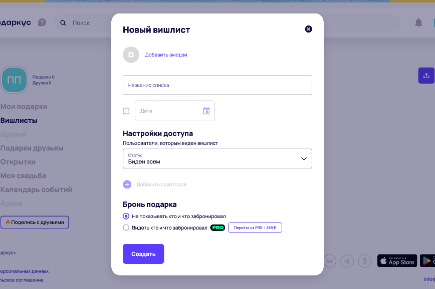 Можно делать несколько списков для разных случаев, а также создавать закрытые списки, которые не видны другим пользователям. С друзьями можно делиться вишлистами целиком или конкретными товарами. Но чтобы забронировать подарок, придётся установить приложение.