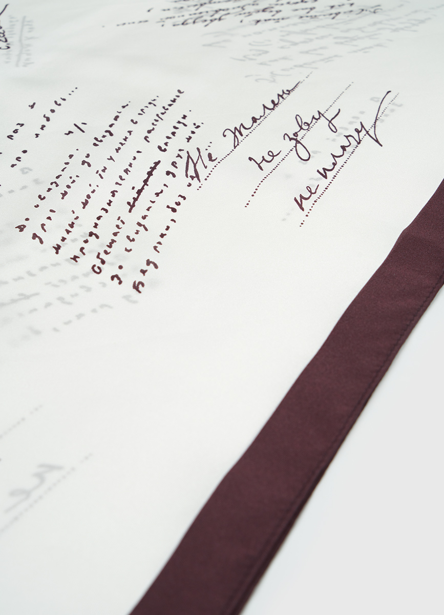 Шёлковый платок, украшенный строчками из стихотворений. Здесь и «Не жалею, не зову, не плачу…», и «Лицом к лицу лица не увидать», и «В первый раз я запел про любовь». Платок можно повязать на голову, шею или даже на талию. Цена — 3 683 рубля.