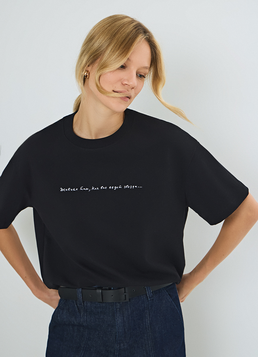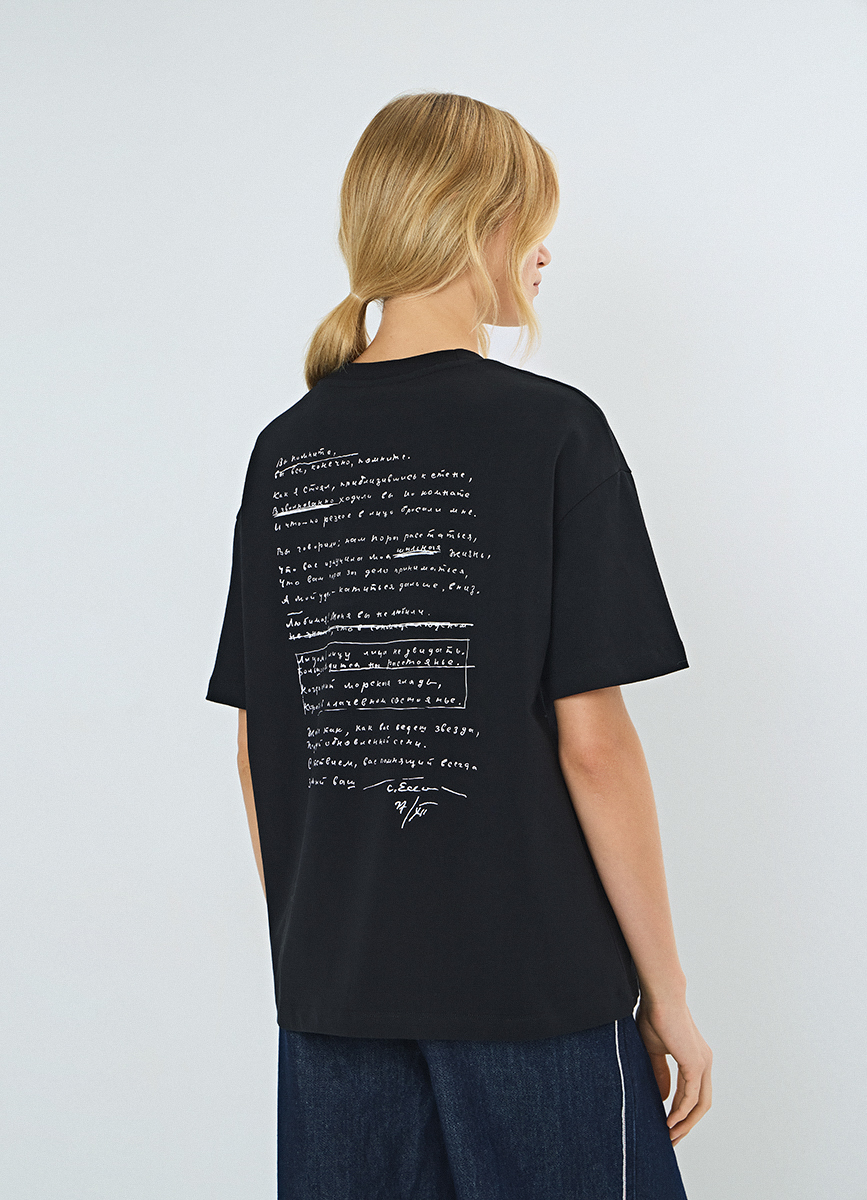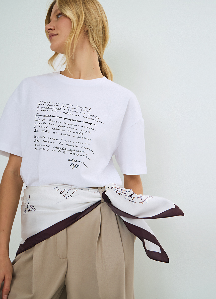 Трикотажная футболка с надписью «Живите так, как вас ведёт звезда…» на груди и стихотворением «Письмо к женщине» на спине. Текст напоминает рукописный: с помарками и буквами, словно выведенными дрожащей рукой. Цена — 2736 рублей.