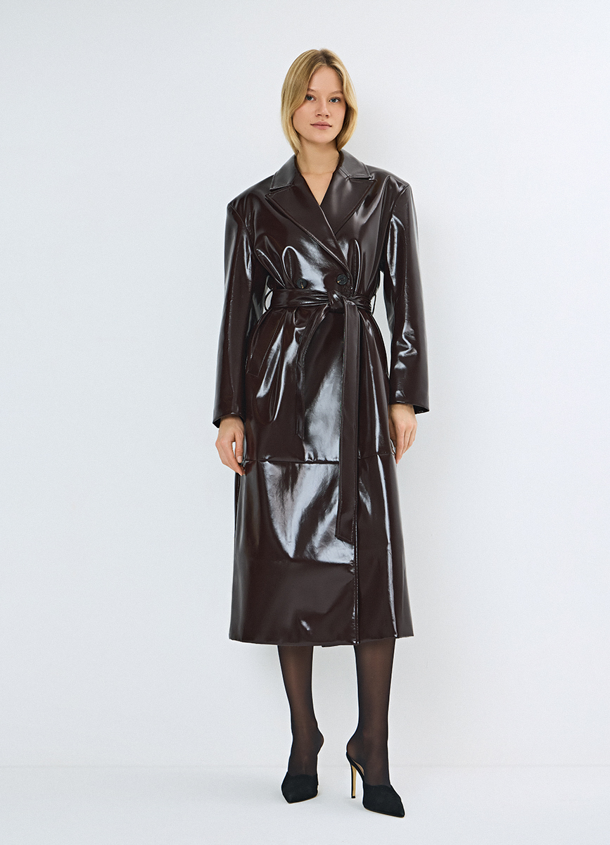 Бордовый тренч из лаковой экокожи длиной до колена. На бирке — строчки «Живите так, как вас ведёт звезда…» из «Письма к женщине». Цена — 12 631 рубль.
