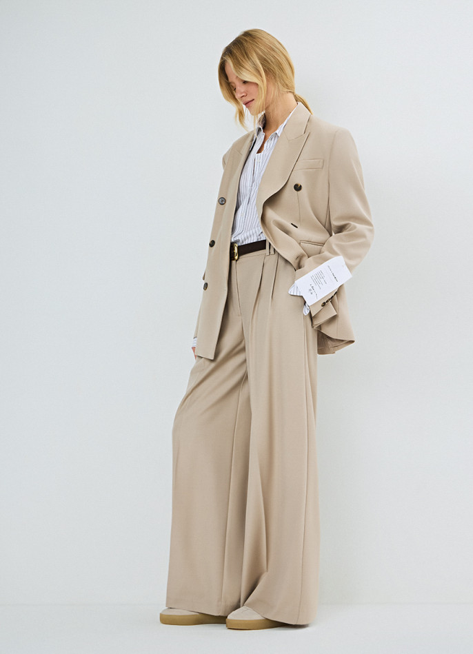 Широкие брюки с добавлением шерсти в светло-бежевом оттенке. Модель отличают декоративные складки, придающие образу сложность и глубину. Цена — 5 262 рубля.