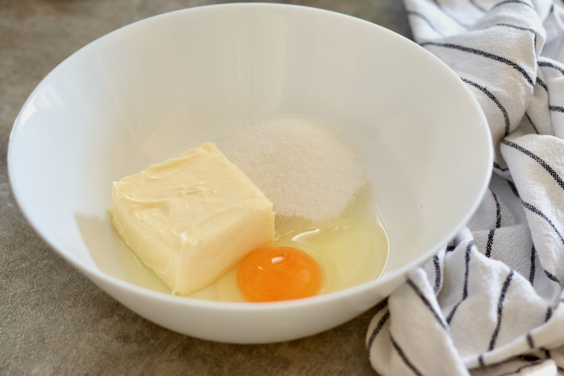 2. В миску выложите масло, яйцо и сахар.