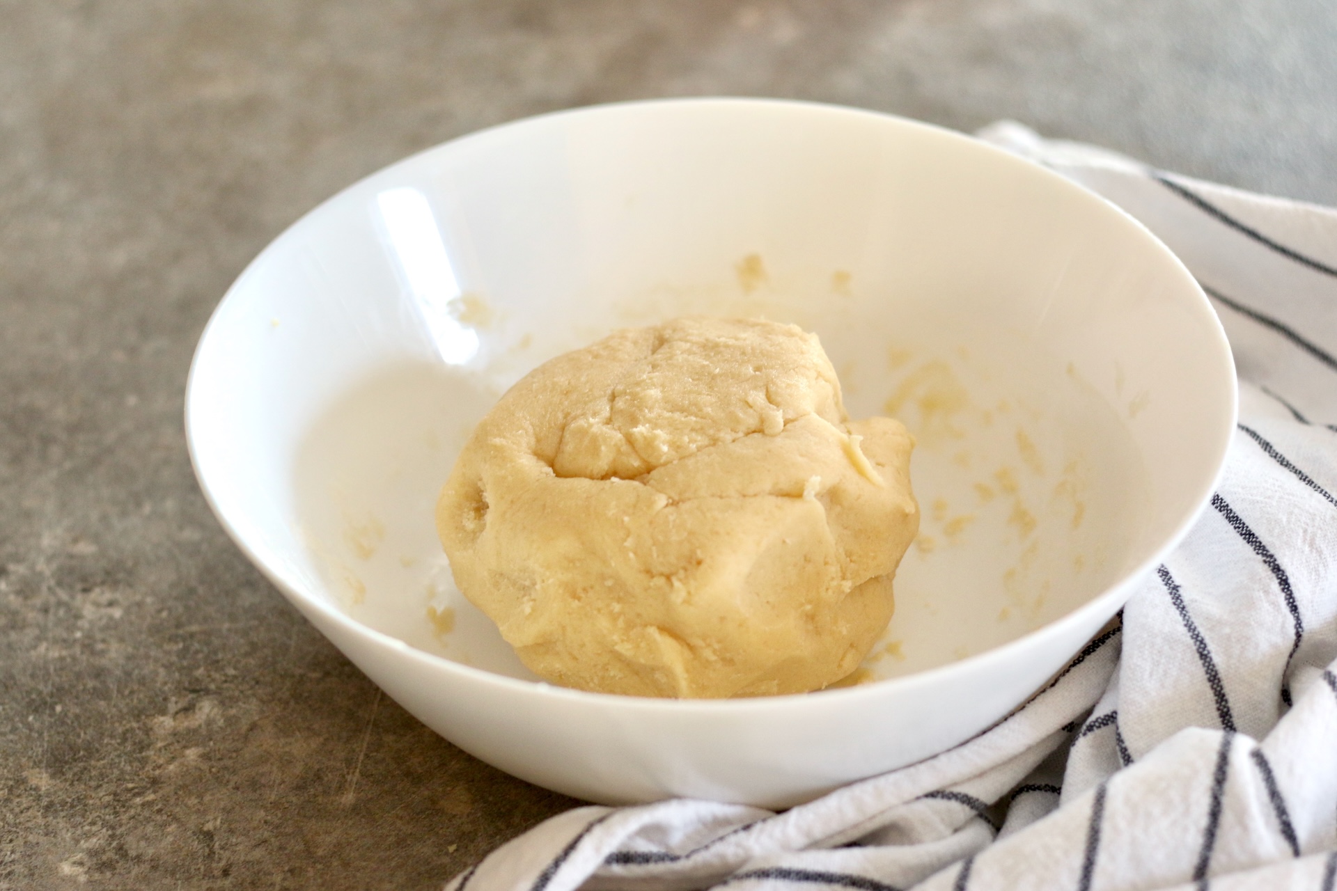4. Всыпьте муку и замесите тесто сначала вилкой, а потом руками. Масса должна собраться в шар.