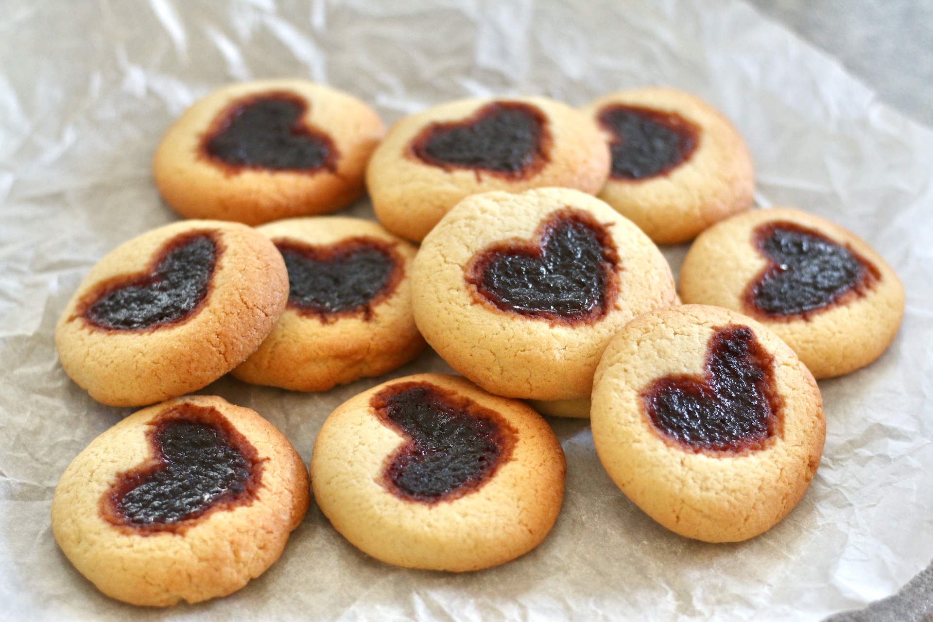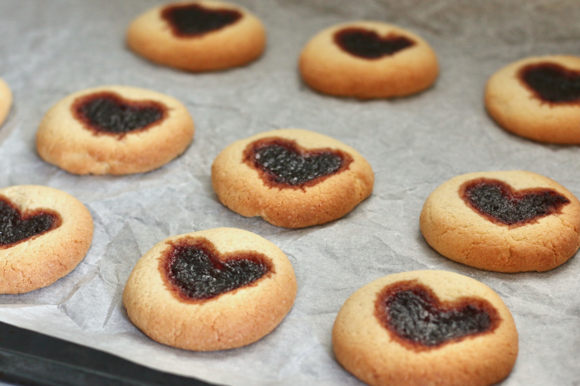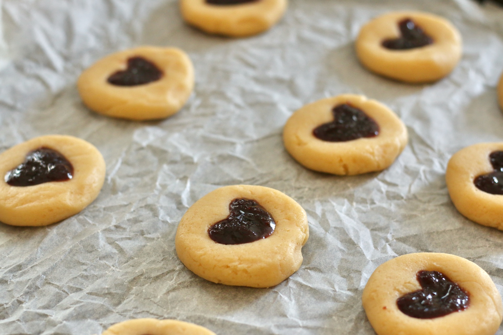 Единственная хитрость — необходимо сделать достаточно глубокие ямки в форме сердечек и положить не слишком много джема. Тогда рисунок не деформируется во время выпечки и будет аккуратным.