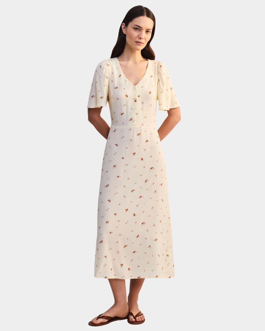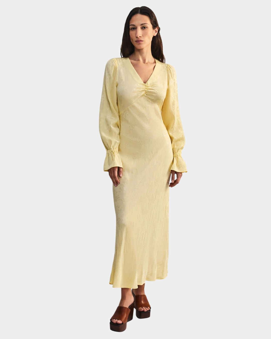 Полюбившийся в прошлых сезонах оттенок «сливочного масла» не зря остаётся с нами и этой весной: он мягко подсвечивает кожу, выглядит деликатно и делает образ по-настоящему солнечным. Ткань мягко обнимает талию и свободно струится по фигуре, помогая визуально вытянуть силуэт. Закрытый верх и длинная юбка универсальны — в таком варианте комфортно днём прогуляться по городу, а вечером сходить в ресторан.