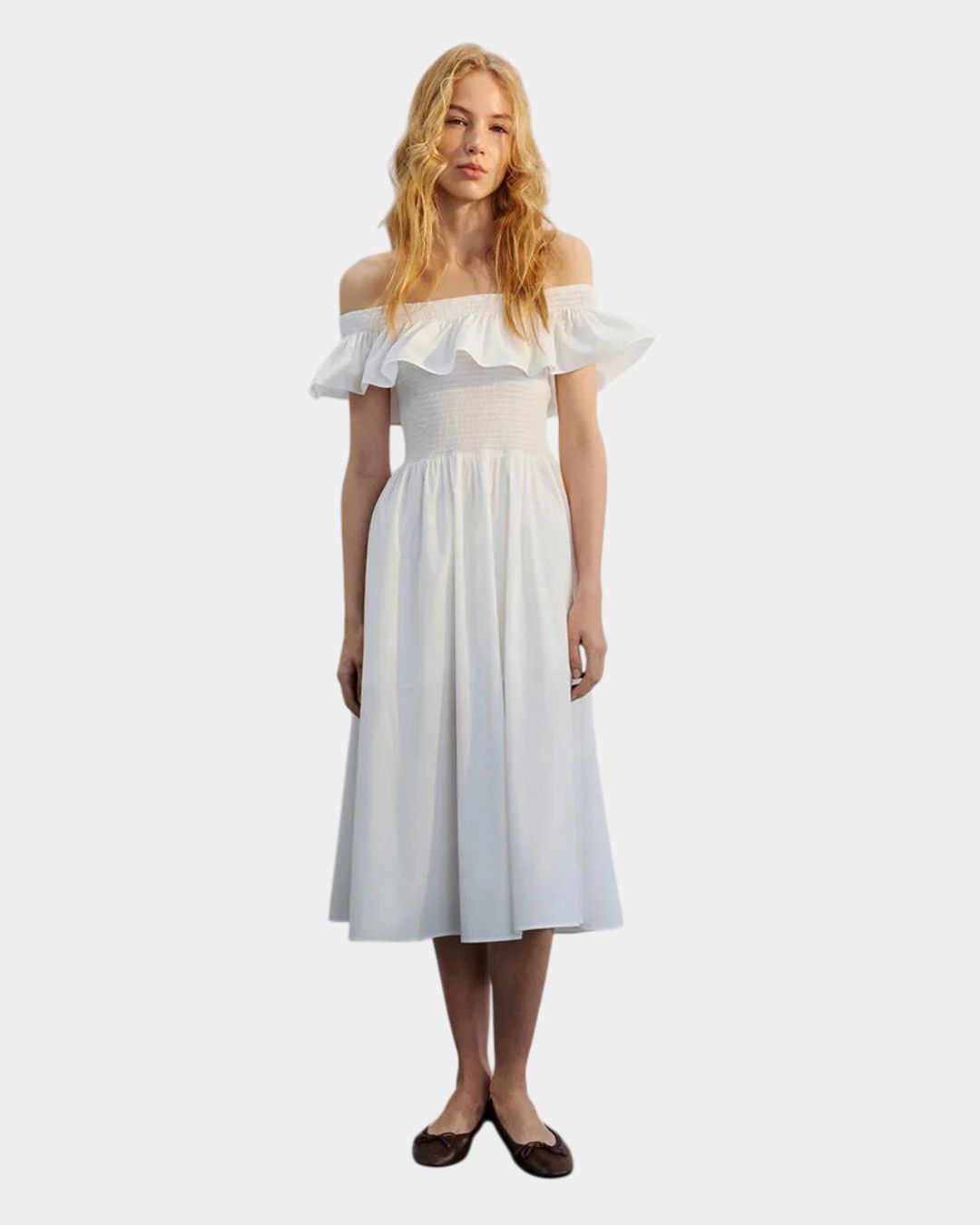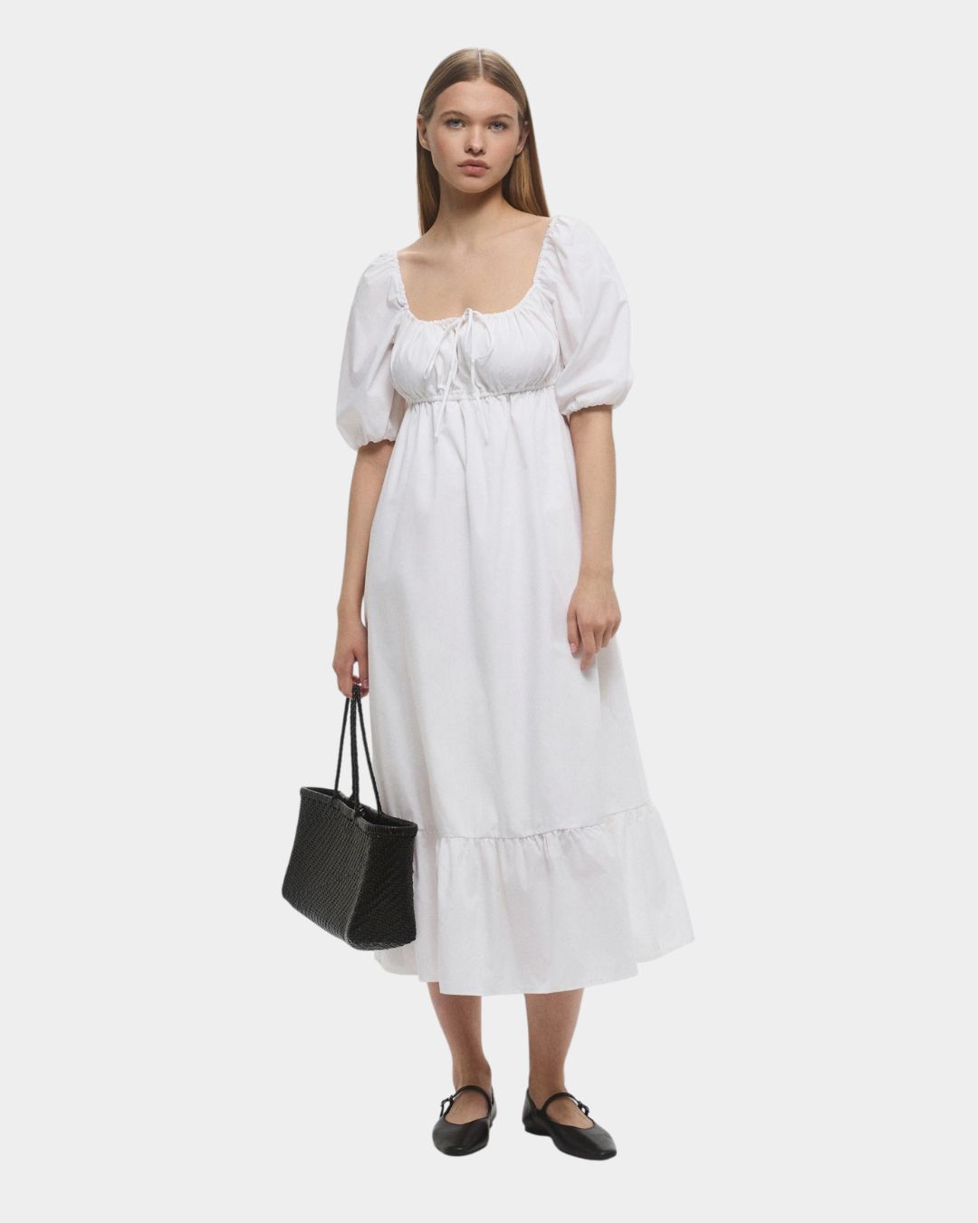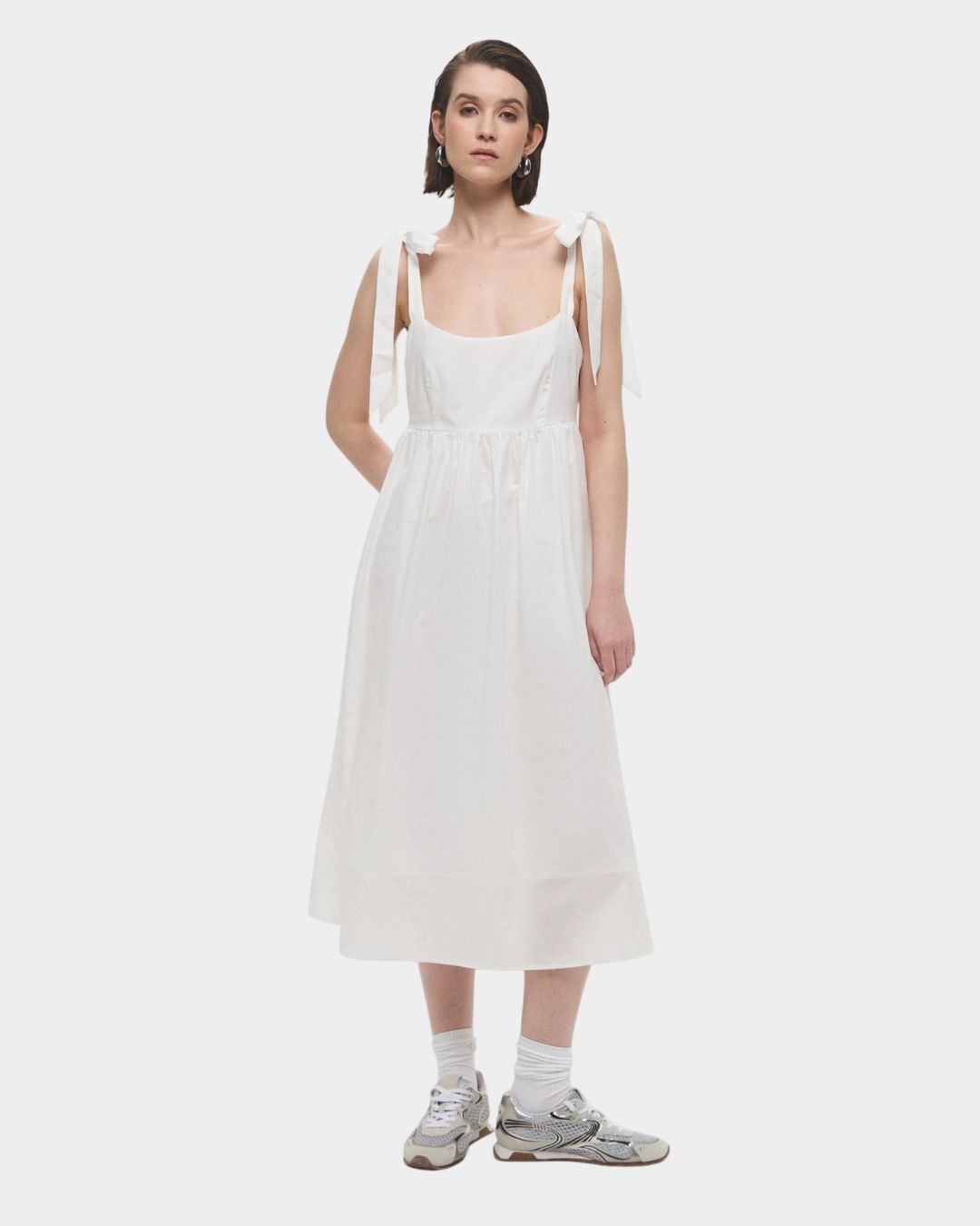 Лаконичный крой, миди‑длина и чистый белый цвет формируют идеальный вариант для солнечных деньков. Бретели‑бантики здесь задают всё настроение и добавляют лёгкой романтики и беззаботности. Ткань полностью из хлопка, а значит, даже в жаркое время в нём не будет душно — кожа скажет спасибо.