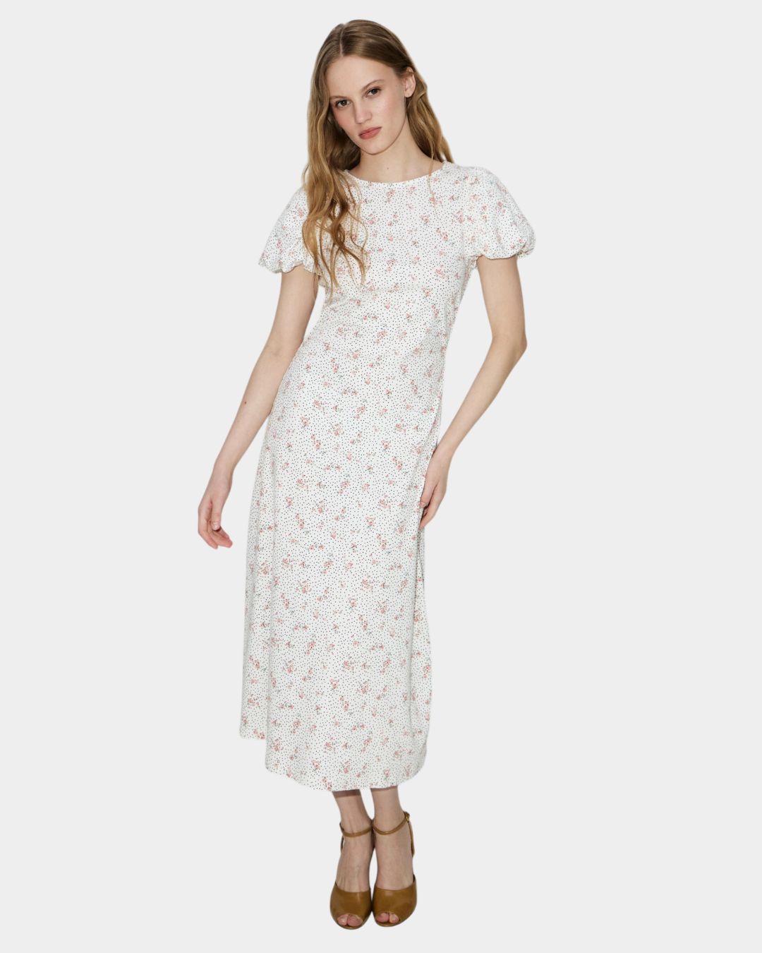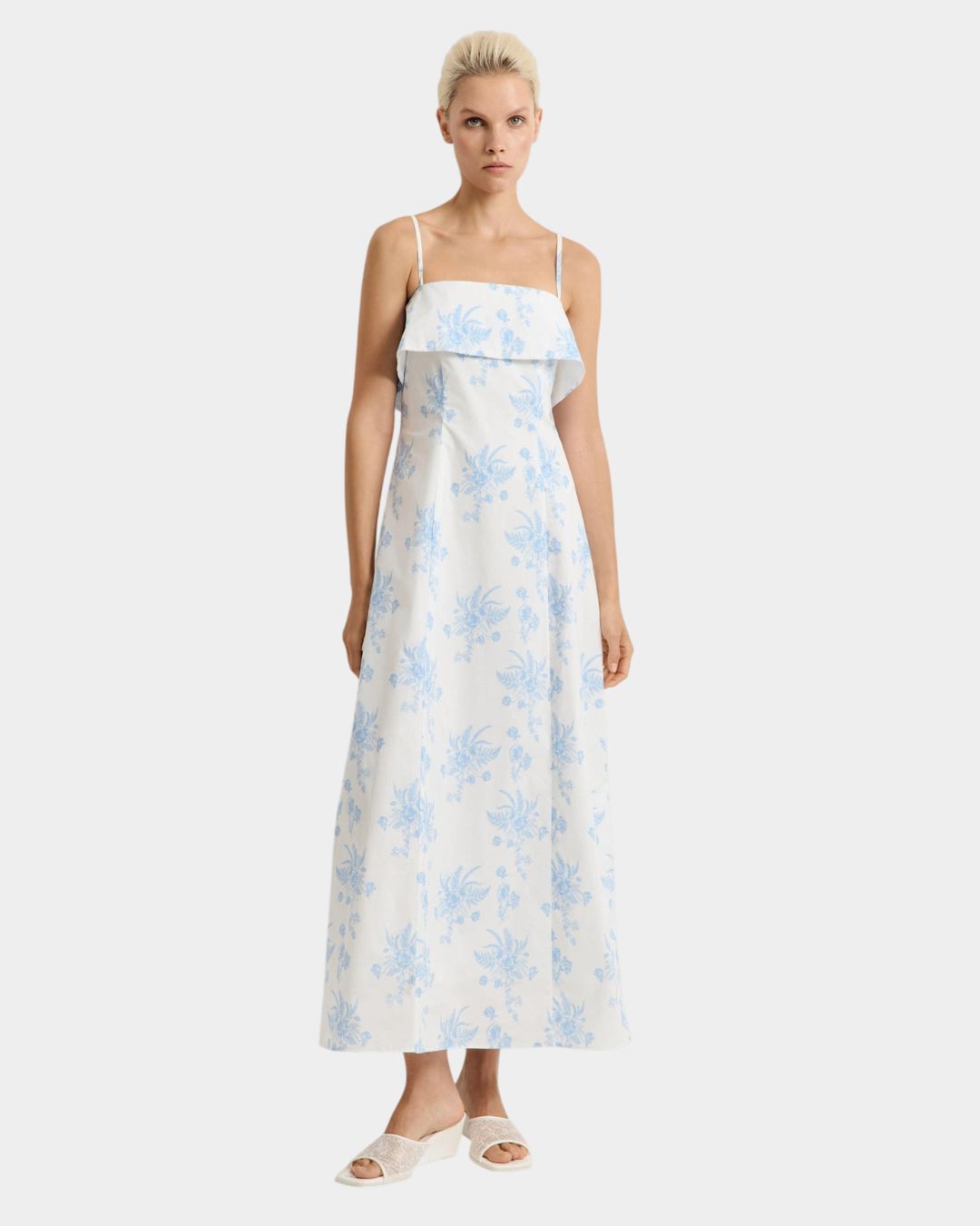 Тёплый сливочный оттенок белого, по которому разбросаны большие голубые цветы. В этом платье хочется наслаждаться весной где-нибудь в Италии, есть лимонное джелато и никуда не спешить. Макси-длина даёт ощущение сдержанности, однако это компенсирует верх с тонкими бретелями.