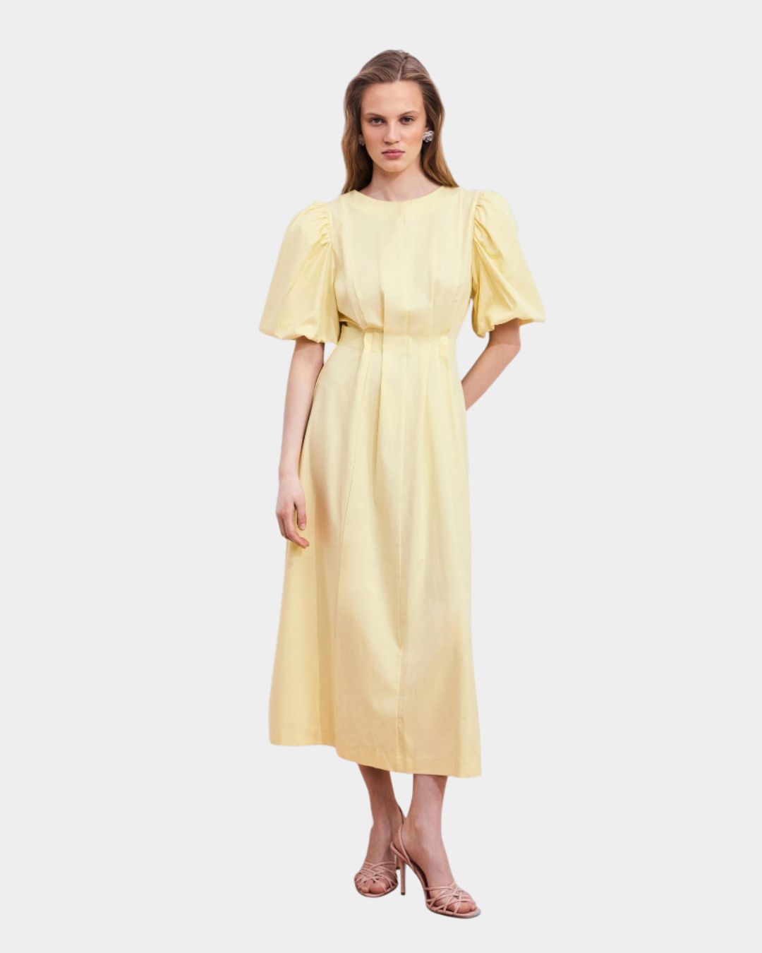 Солнечный цвет, закрытый верх и длинный силуэт воплощают цельный, аккуратный образ на каждый день. Платье держит форму благодаря хлопку в составе: в отзывах его хвалят за приятный материал. Рукава до середины локтя добавляют немного ретростиля и делают верх чуть интереснее, но не перегружают его.