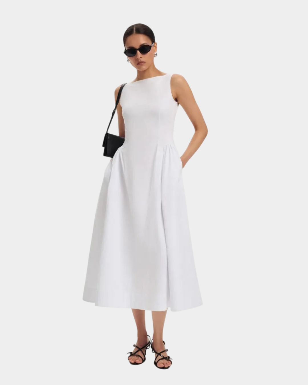 Лаконичный и аккуратный вариант — подходит как на каждый день, так и на выход. Настроение можно менять с помощью аксессуаров — например, добавить плетёную сумку, сандалии или балетки для расслабленного образа либо лодочки и небольшой клатч для более официального мероприятия. А‑силуэт мягко подчёркивает линию талии, а текстиль из хлопка с добавлением спандекса комфортно садится по фигуре. А ещё здесь есть карманы!