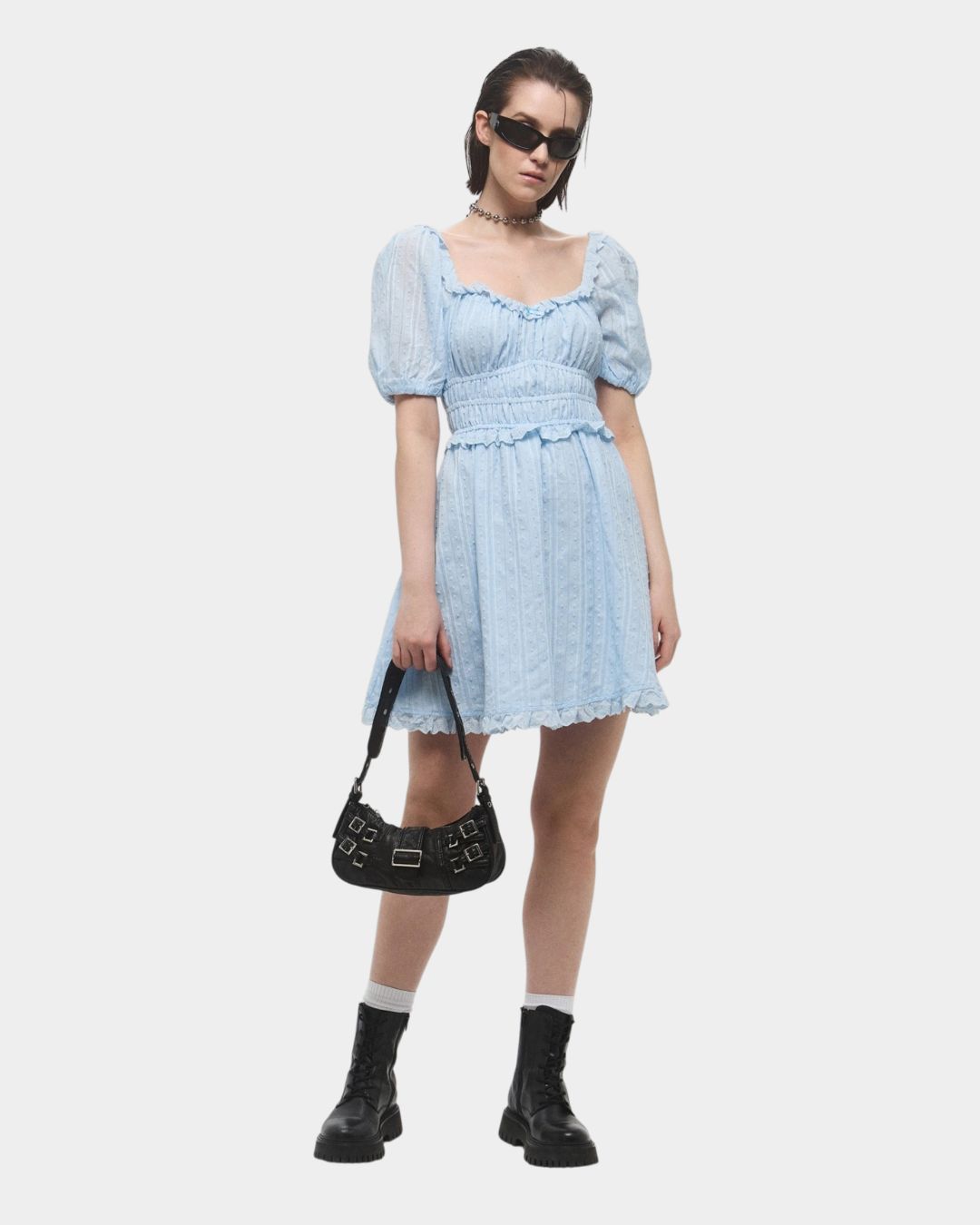 Чистый небесный оттенок этого варианта делает его похожим на летние цветы — колокольчики. В сочетании с рукавами-фонариками и длиной мини получается воздушный и немного мечтательный образ. Но если не хочется уходить в излишнюю зефирность, можно добавить немного характера: тёмные колготки, грубые ботинки и кожаную куртку.
