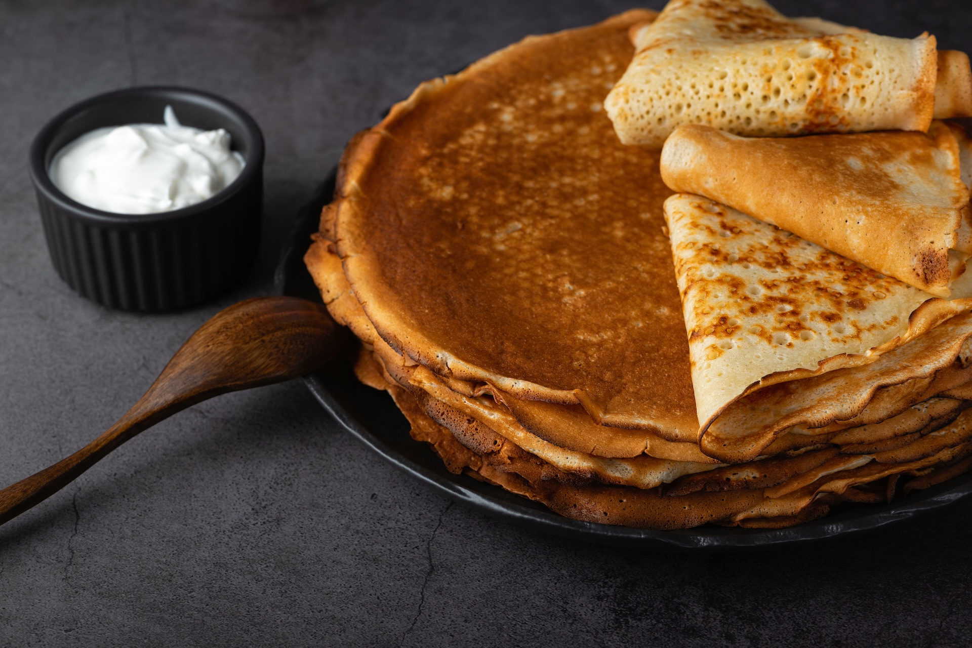 Блины на обезжиренном кефире могут быть суховаты. А если взять слишком жирную основу, выпечка выйдет тяжёлой. Оптимальный вариант — кефир жирностью 2–3%.