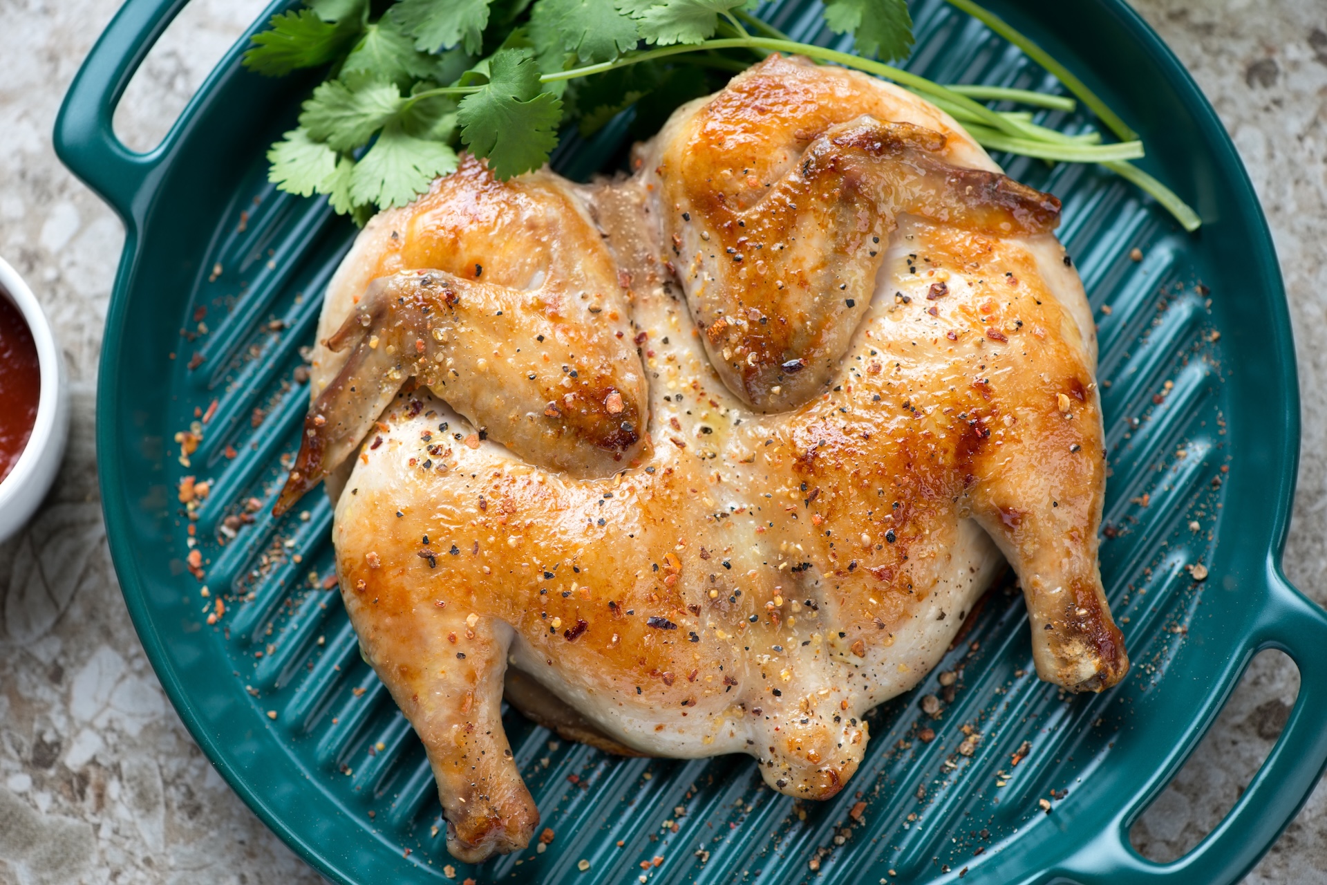Этот рецепт подходит для аэрогрилей с вместительной чашей объёмом от 6–7 литров. Если у вас аппарат меньшего размера, разрежьте птицу на кусочки и готовьте порционно.