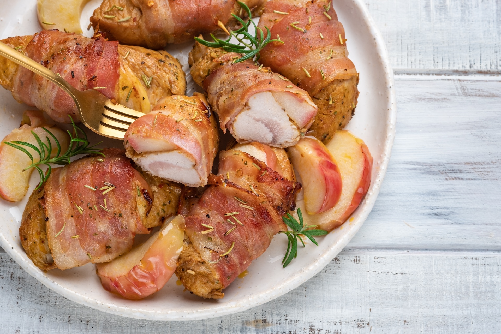 - Сложите вместе брусок индейки и ломтик яблока. Оберните беконом, закрепив зубочистками при необходимости.