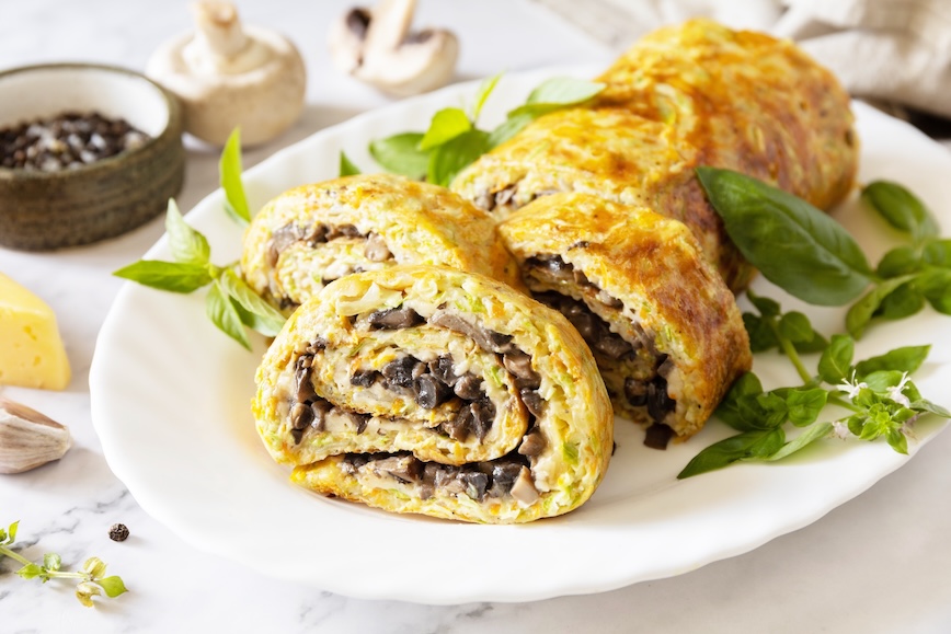 - На кабачковый пласт выложить начинку. Аккуратно свернуть в рулет, помогая себе бумагой. Перед подачей нарезать порционными кусочками.