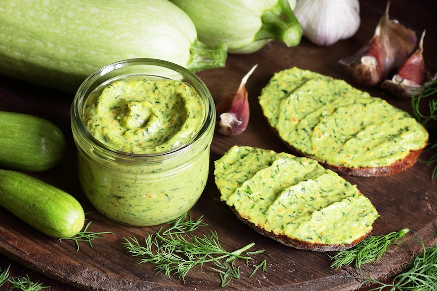 - Сложить в блендер кабачок, плавленый сыр, чеснок и укроп. Взбить до однородной кремовой консистенции.
