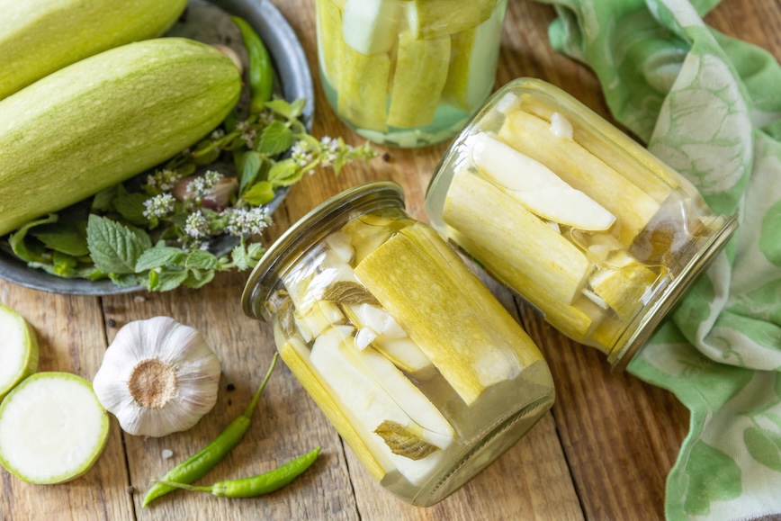- В стерилизованные банки уложить кабачки, перекладывая чесноком, острым перцем и веточками мяты.