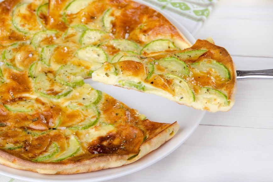 Кабачковый пирог на тонком песочном тесте напоминает пиццу только на вид. По вкусу получается гораздо нежнее благодаря заливке из сметаны и сыра.