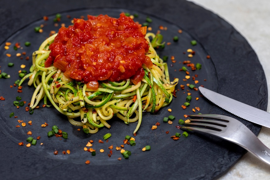 Лёгкое диетическое блюдо для жаркого летнего дня. А если всё же захочется сделать спагетти из кабачка более сытными, попробуйте добавить креветки или колбаски.