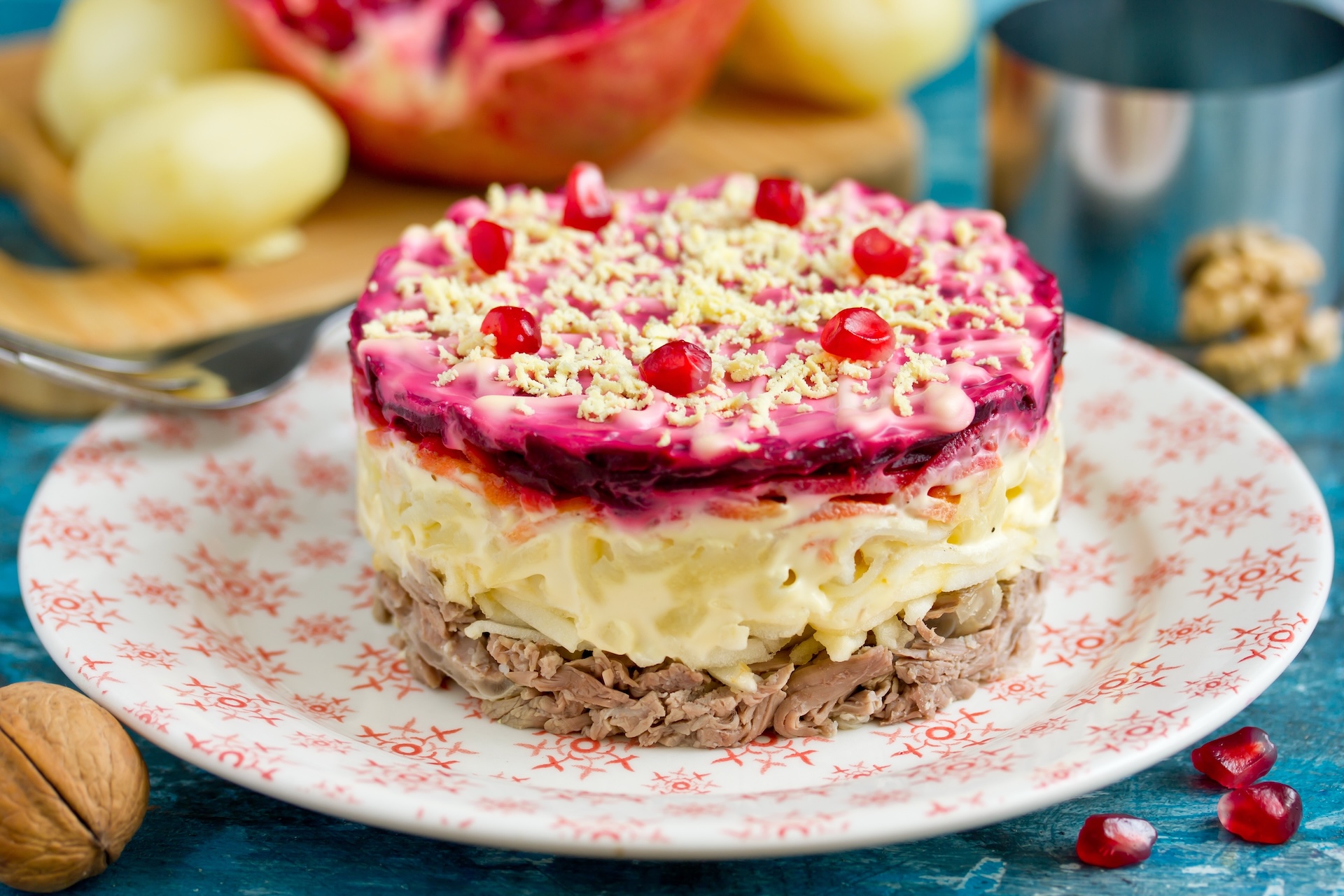 Слоёный салат с мясом и свёклой