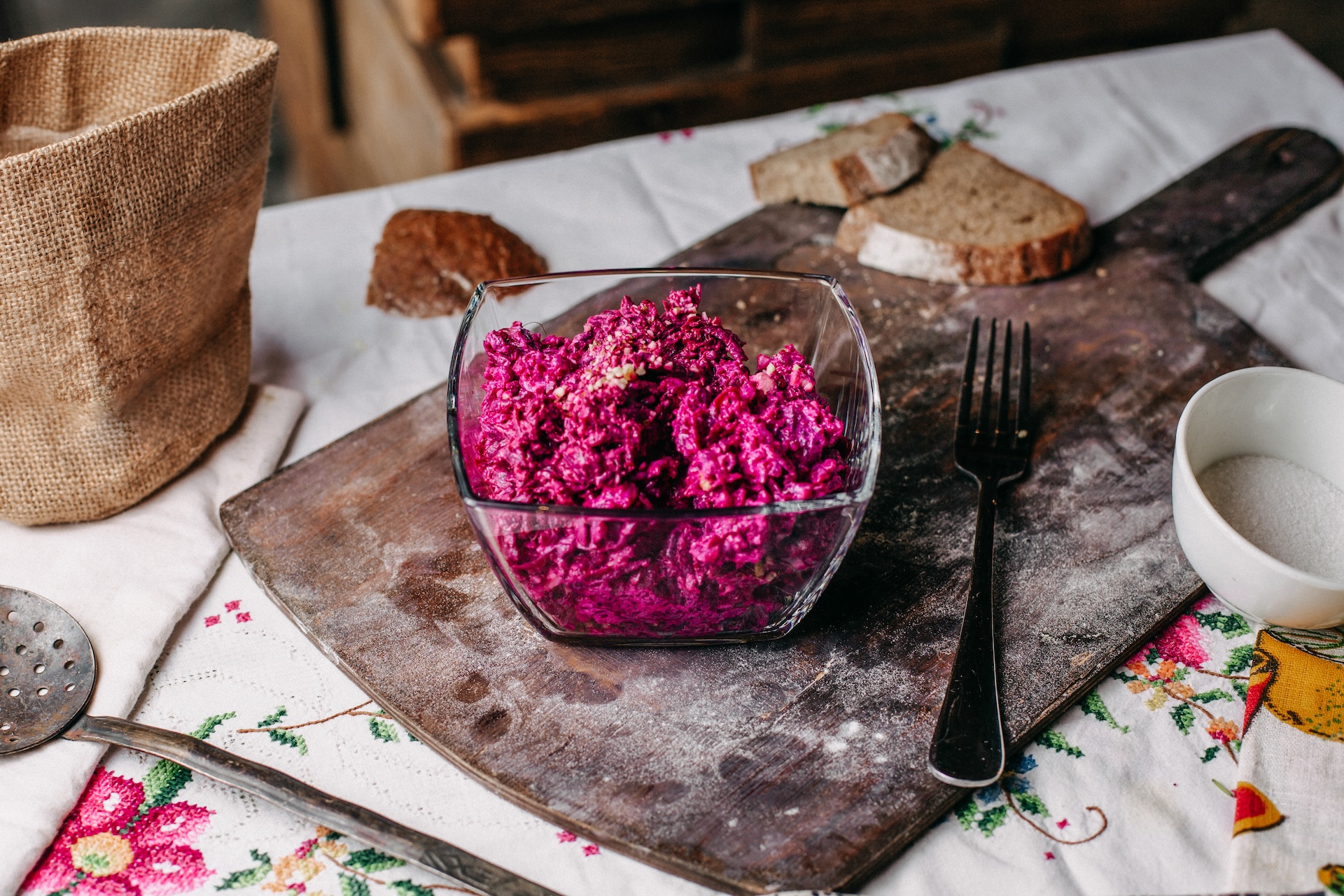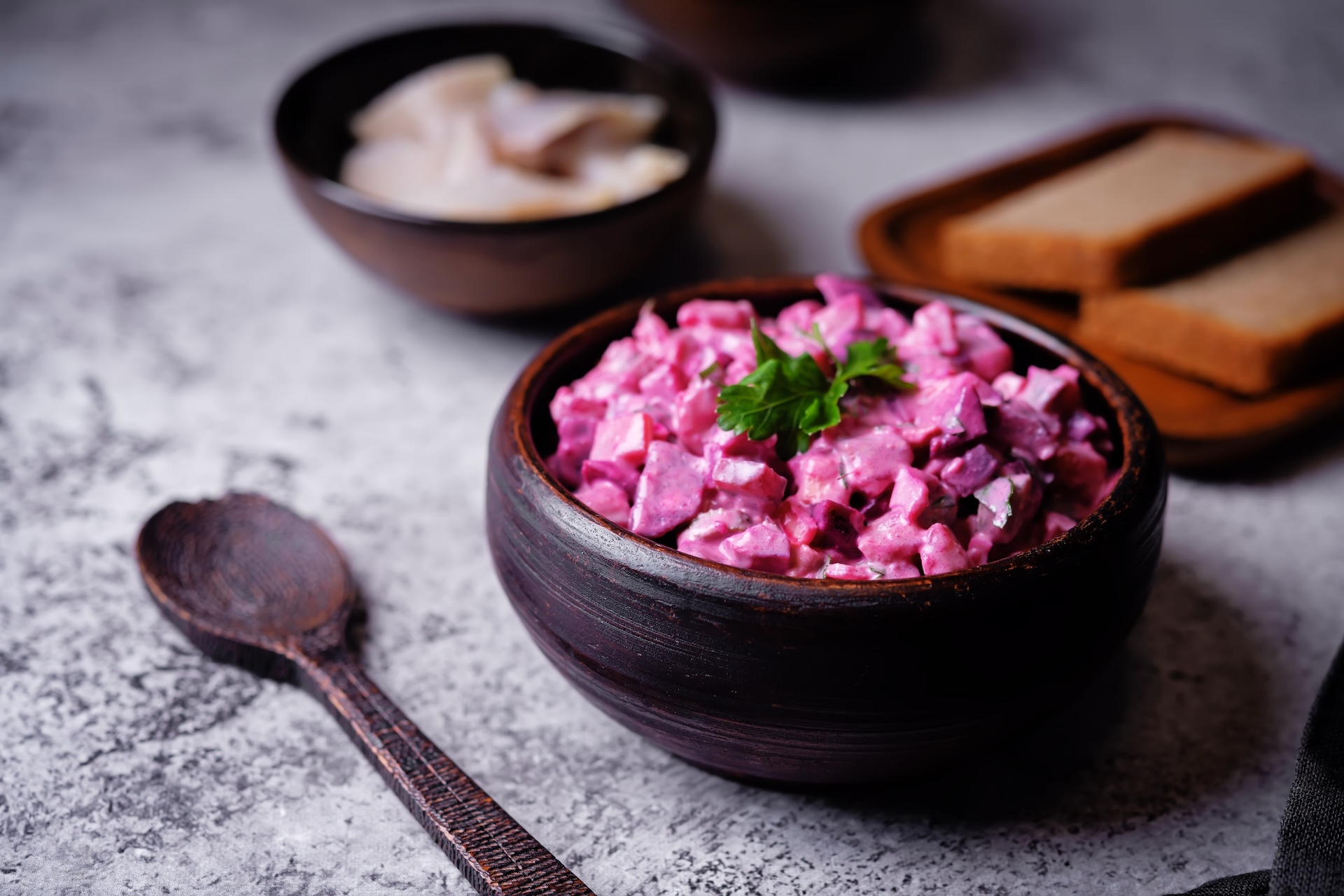 Это базовый свекольный салат без лишних добавок. Сладкая варёная свёкла и острый чеснок уравновешивают друг друга, а майонез делает вкус более нежным. Блюдо подойдёт и для праздничного стола, и на каждый день.