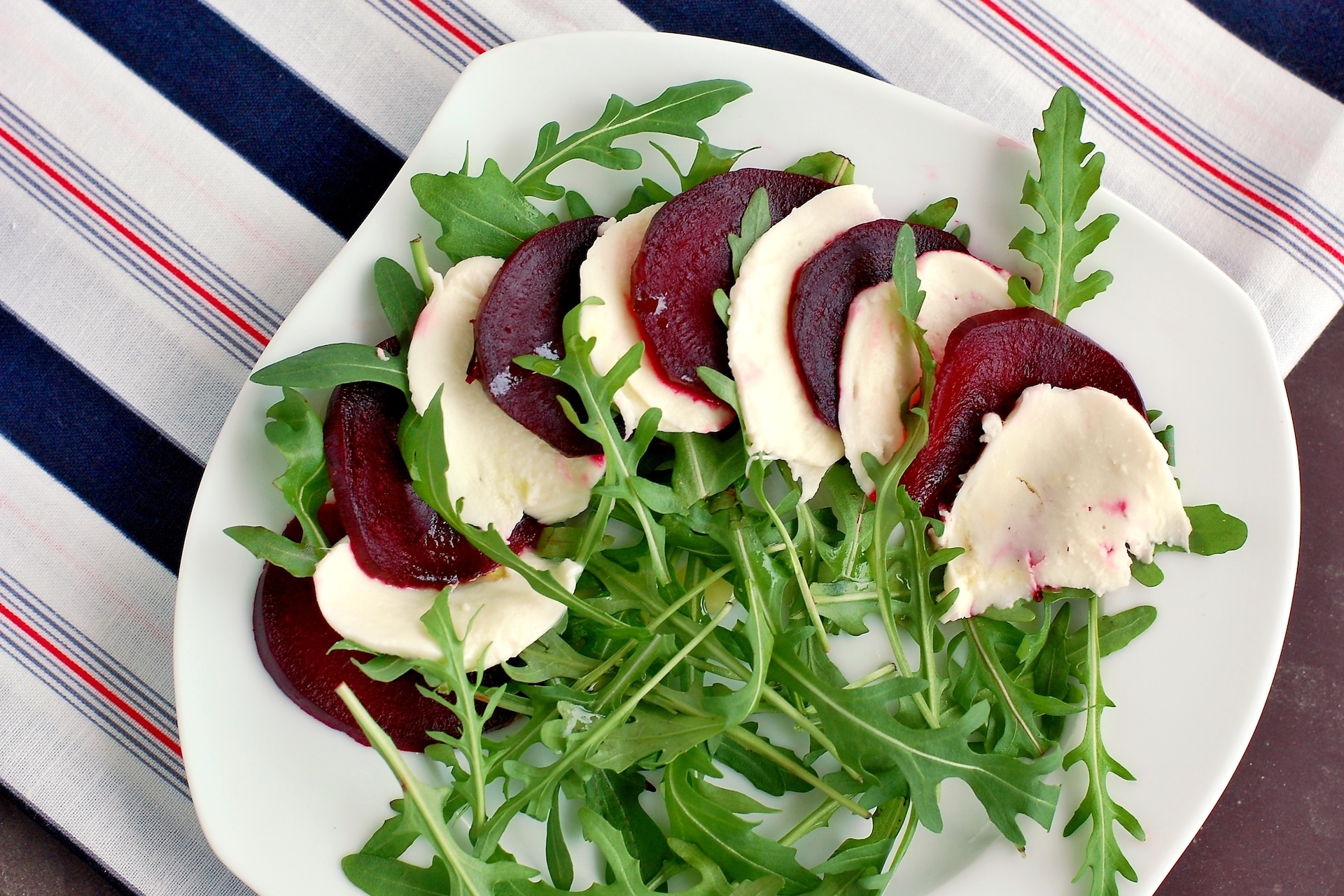 - Выложите сверху свёклу и моцареллу, чередуя ломтики.