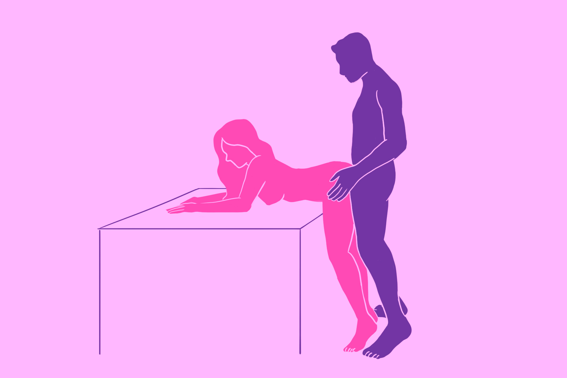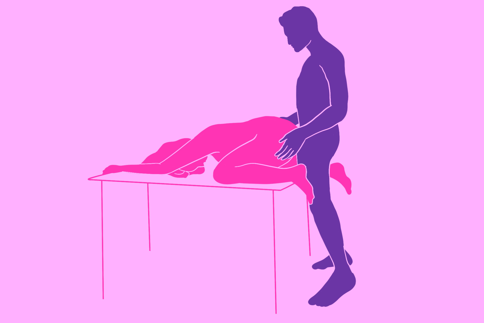 Это комфортная вариация позиции догги-стайл благодаря дополнительной опоре, которую даёт столешница. Женщина ложится на стол животом, а мужчина входит сзади.