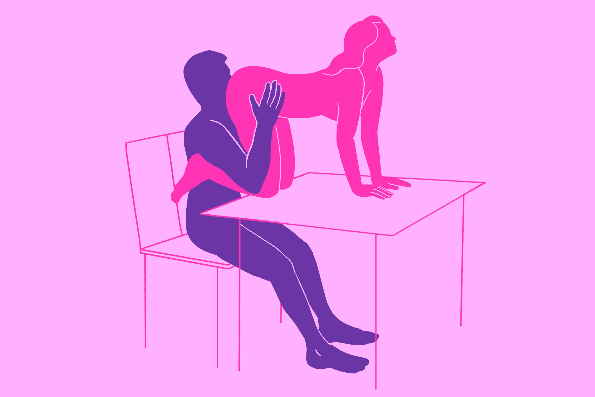 Это удачная поза для оральных ласк, в особенности анилингуса. Женщина располагается на столе на четвереньках, а мужчина садится на стул. Так он может ласкать партнёршу в комфортном положении, без напряжения в шее.