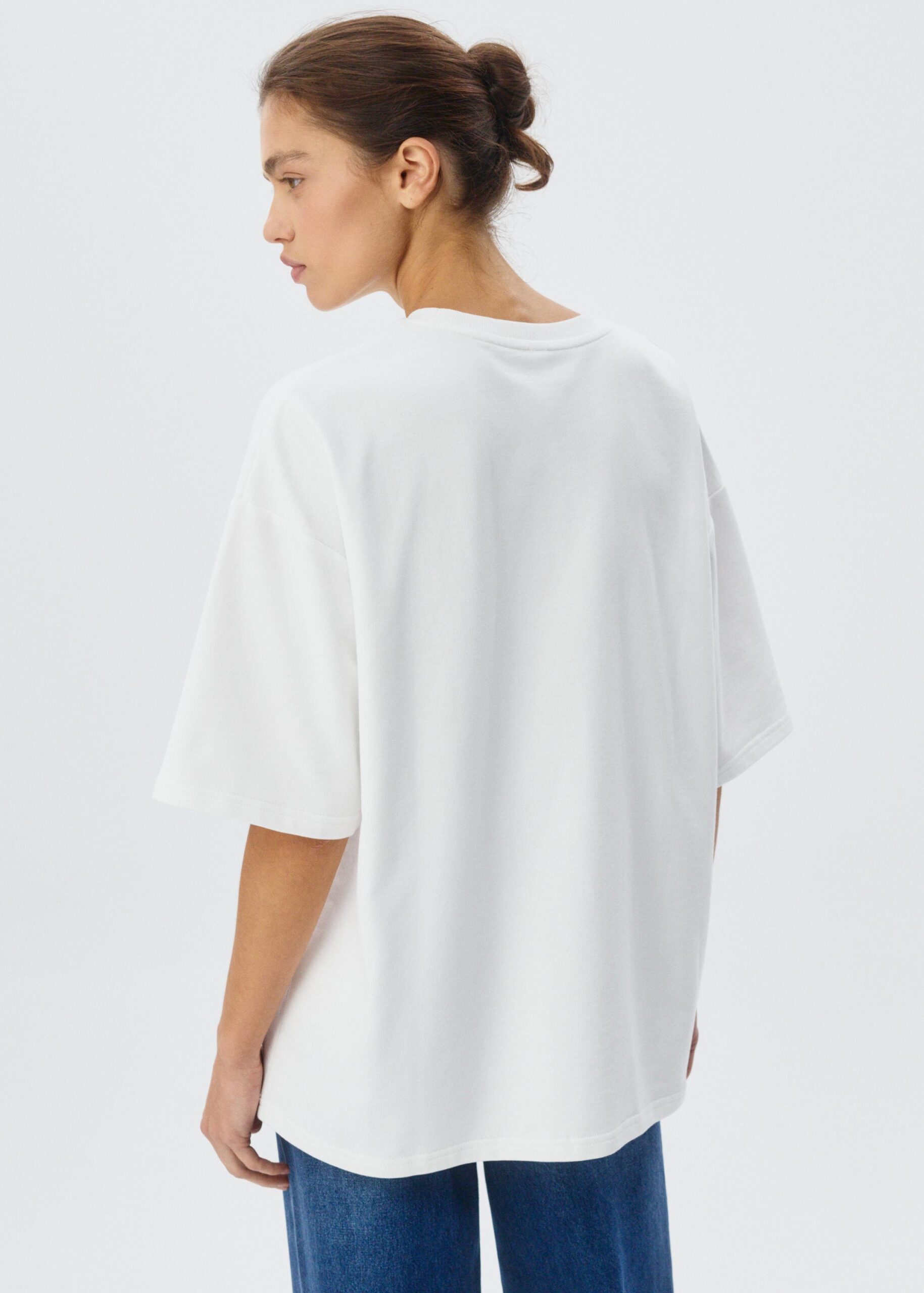 Футболка выполнена из плотного хлопкового трикотажа с петельчатой изнанкой. Свободный крой со спущенной линией плеча. Круглый вырез горловины в рубчик. Свободный рукав длиной до локтя.