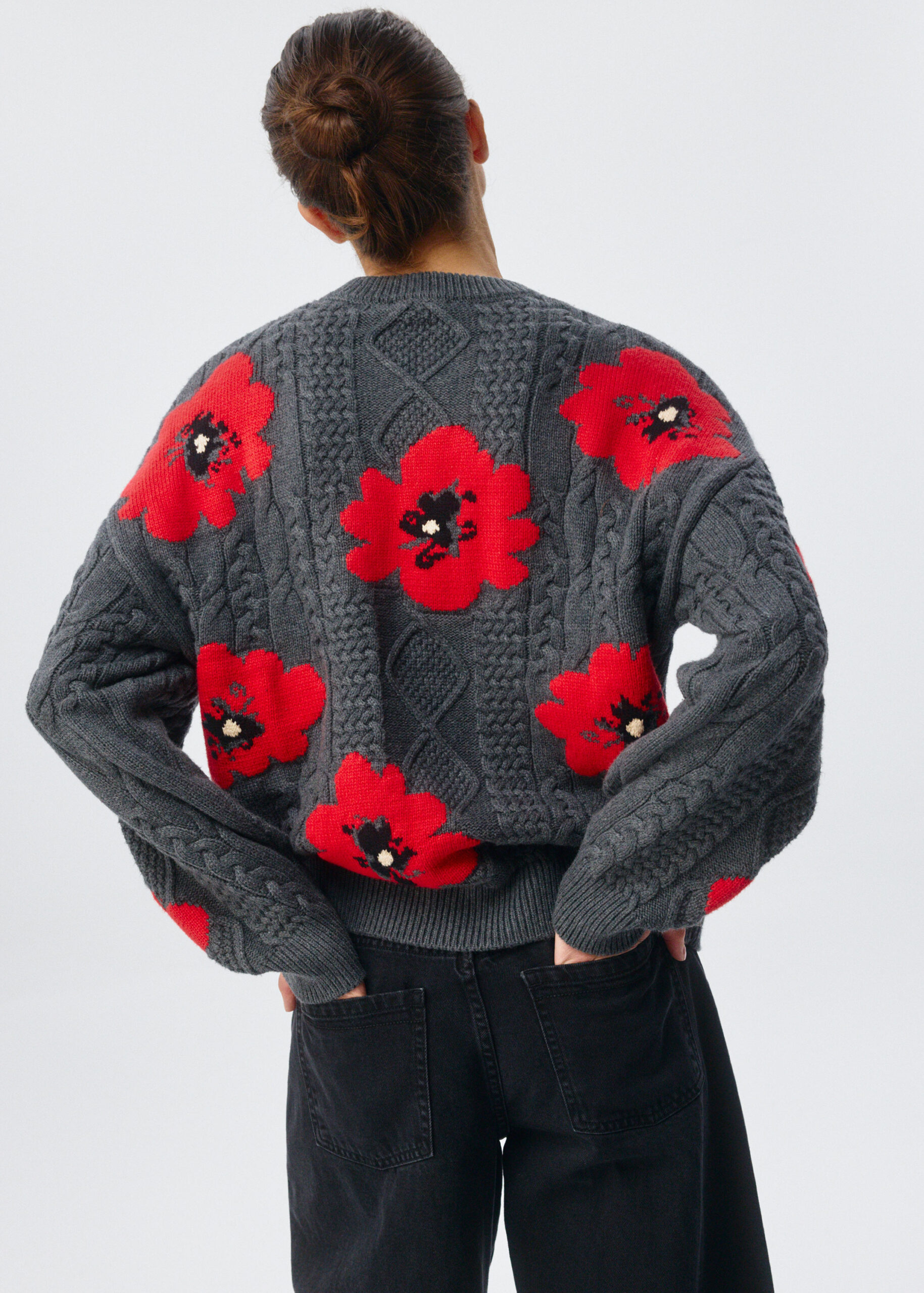Джемпер фактурной вязки с акцентным узором объёмных кос и цветов в технике интарсия. Выполнен из мягкой пряжи с содержанием шерсти. Свободный крой со спущенной линией плеча. Круглый вырез горловины и длинный рукав. Горловина манжеты и подол в рубчик.