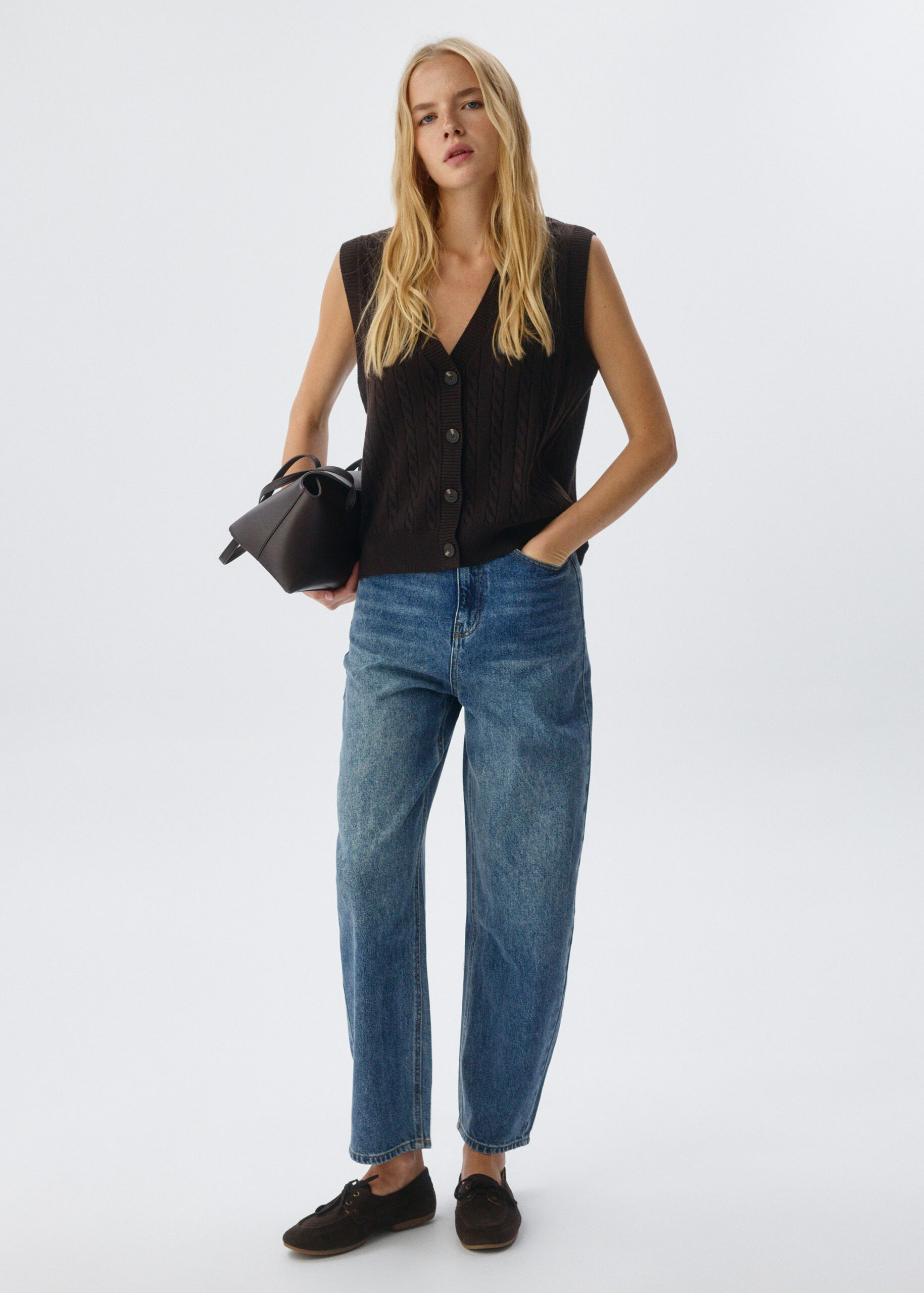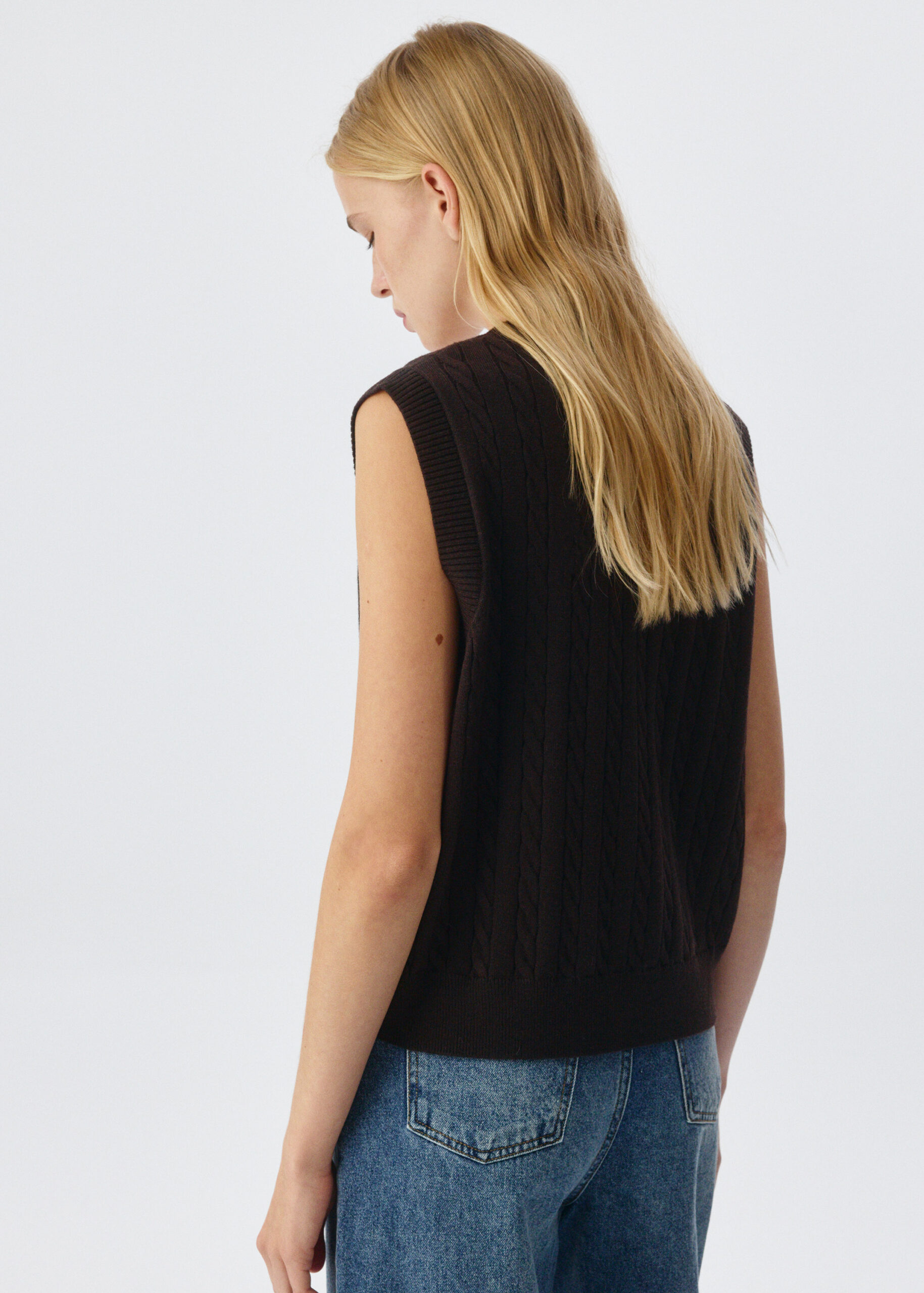 Вязаный жилет фактурной вязки с косами. Мягкий трикотаж с содержанием шерсти. Прилегающий силуэт с V‑образным вырезом горловины. Застёжка на пуговицы.