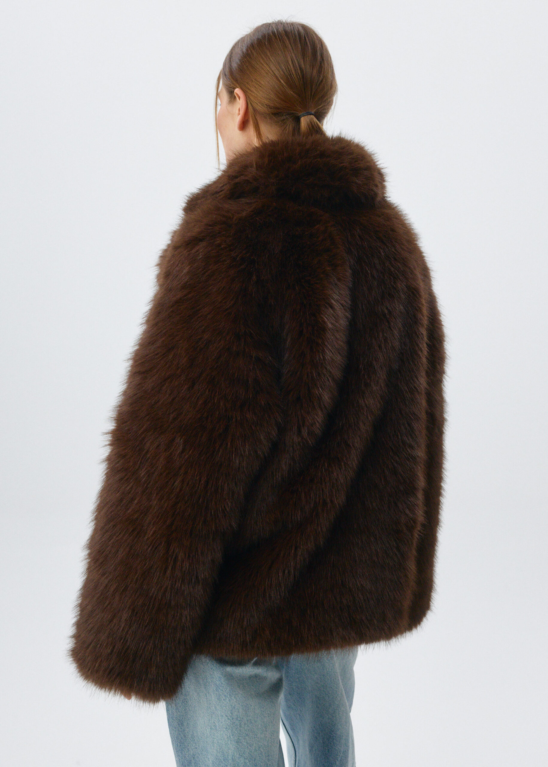 Шуба выполнена из мягкого искусственного меха. Свободный прямой крой со спущенным плечом и длинными рукавами. Отложной воротник с лацканами, застёжка на металлические крючки, прорезные карманы. Утеплитель из синтепона и стёганая подкладка. Рекомендованный температурный режим: от 0 до −5 градусов.