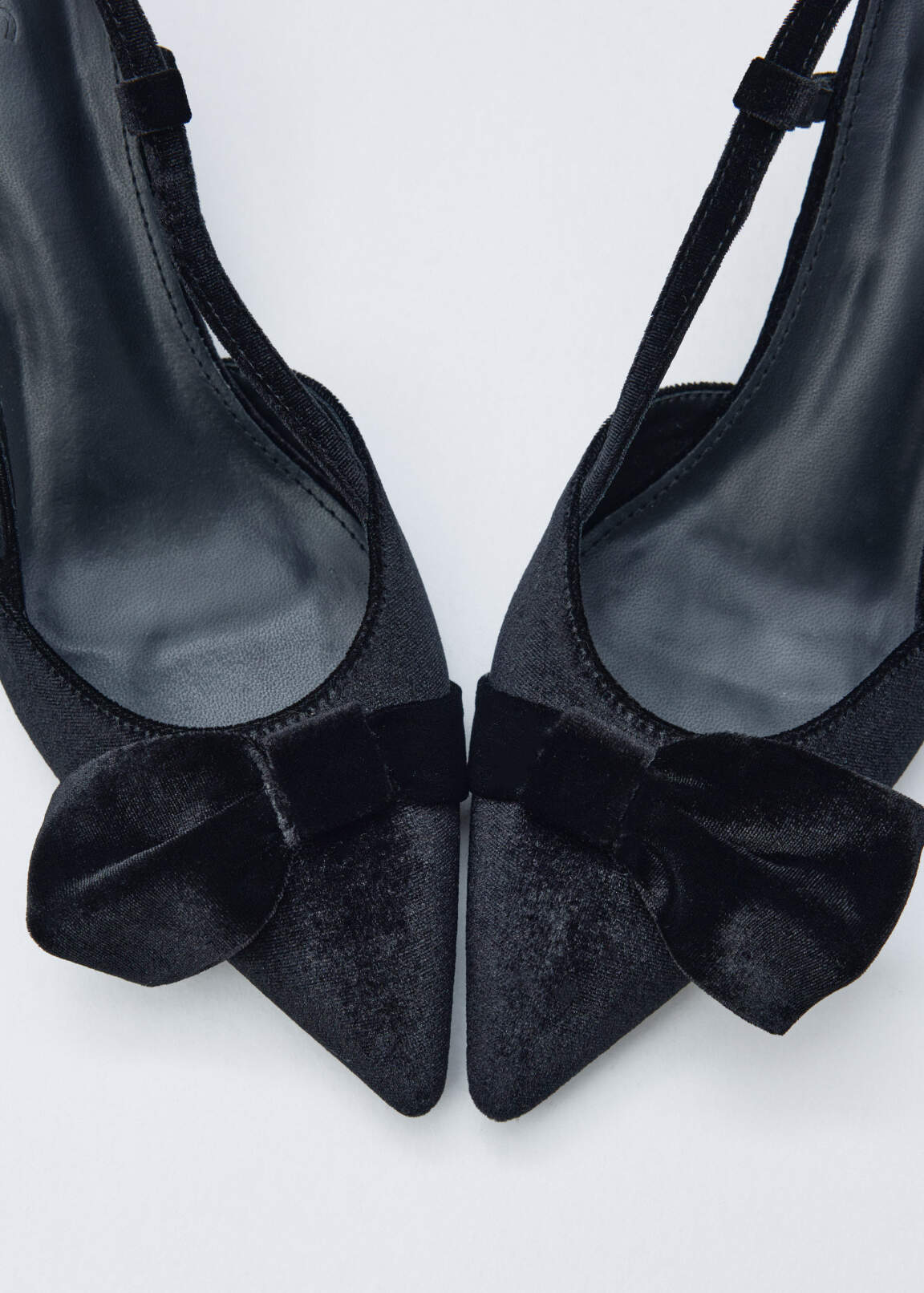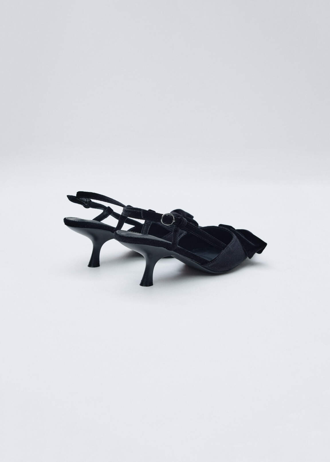 Бархатные туфли-слингбэки с опоясывающим пятку ремешком и асимметричным бантом на союзке. Заострённая носочная часть. Фигурный каблук трендового силуэта.