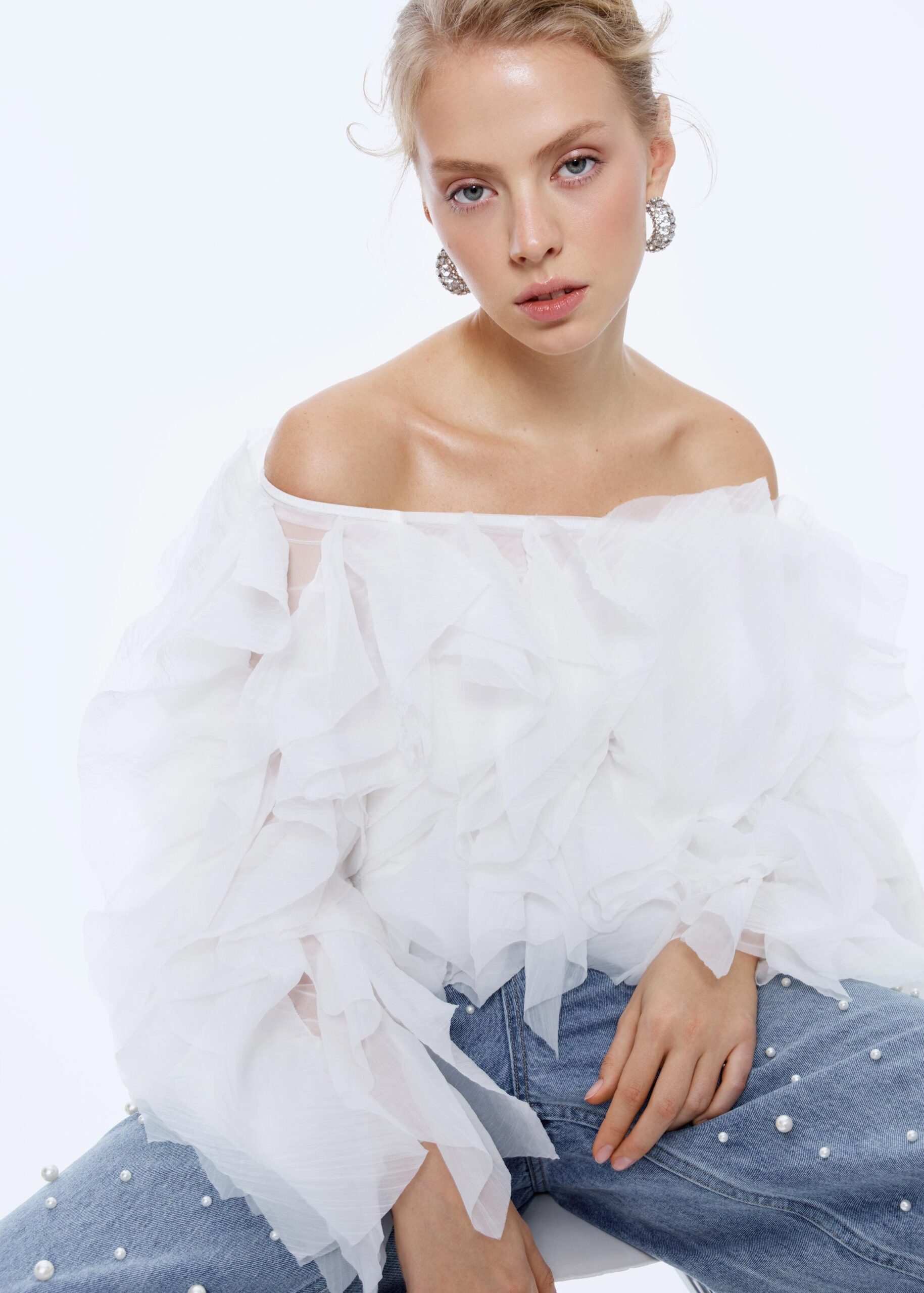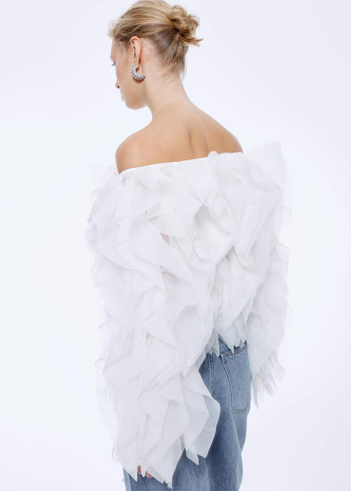 Объёмный топ с воланами из органзы. Основа из трикотажной сетки в тон. Спущенная линия плеч с эластичной резинкой внутри. Укороченная длина.