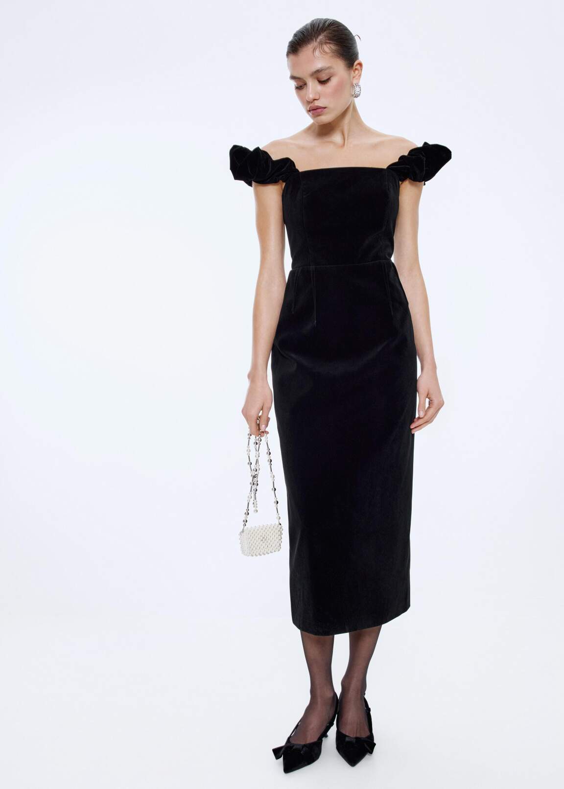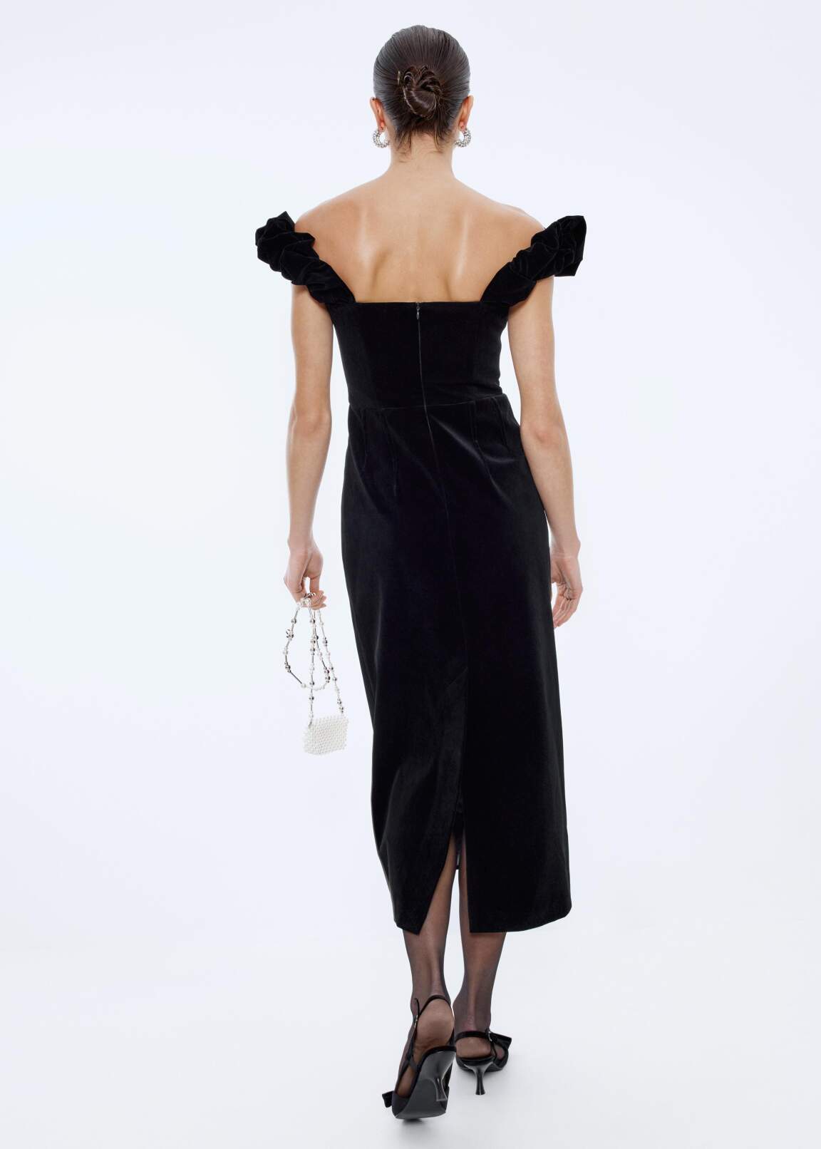 Бархатное платье с открытыми плечами и прямой линией горловины на подкладке. С рельефами по торсу, отрезной талией и прямой юбкой длины выше щиколотки со шлицей сзади. Небольшие спущенные рукава собраны на пышную сборку на резинке внутри. На спинке застёжка на потайную молнию.