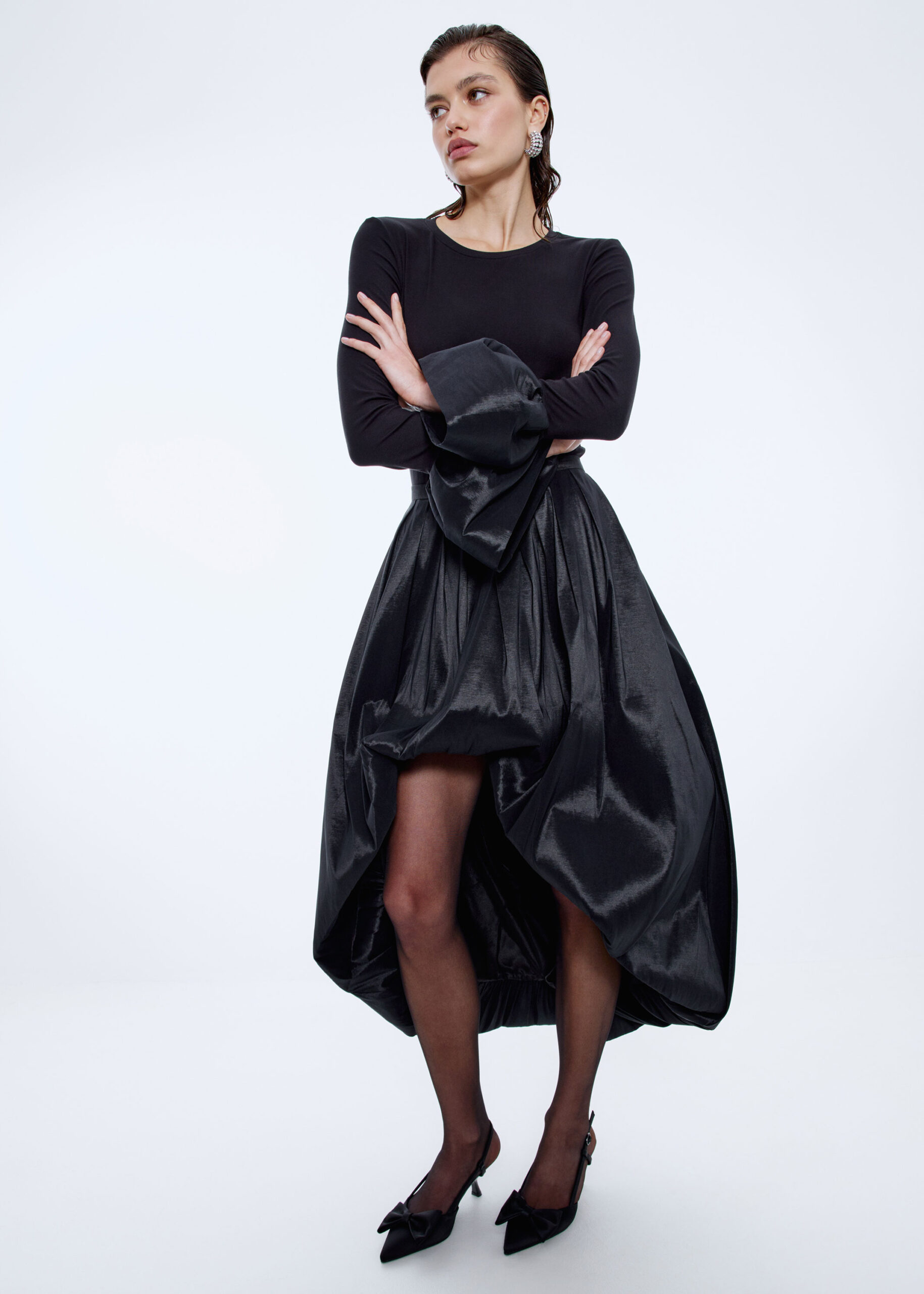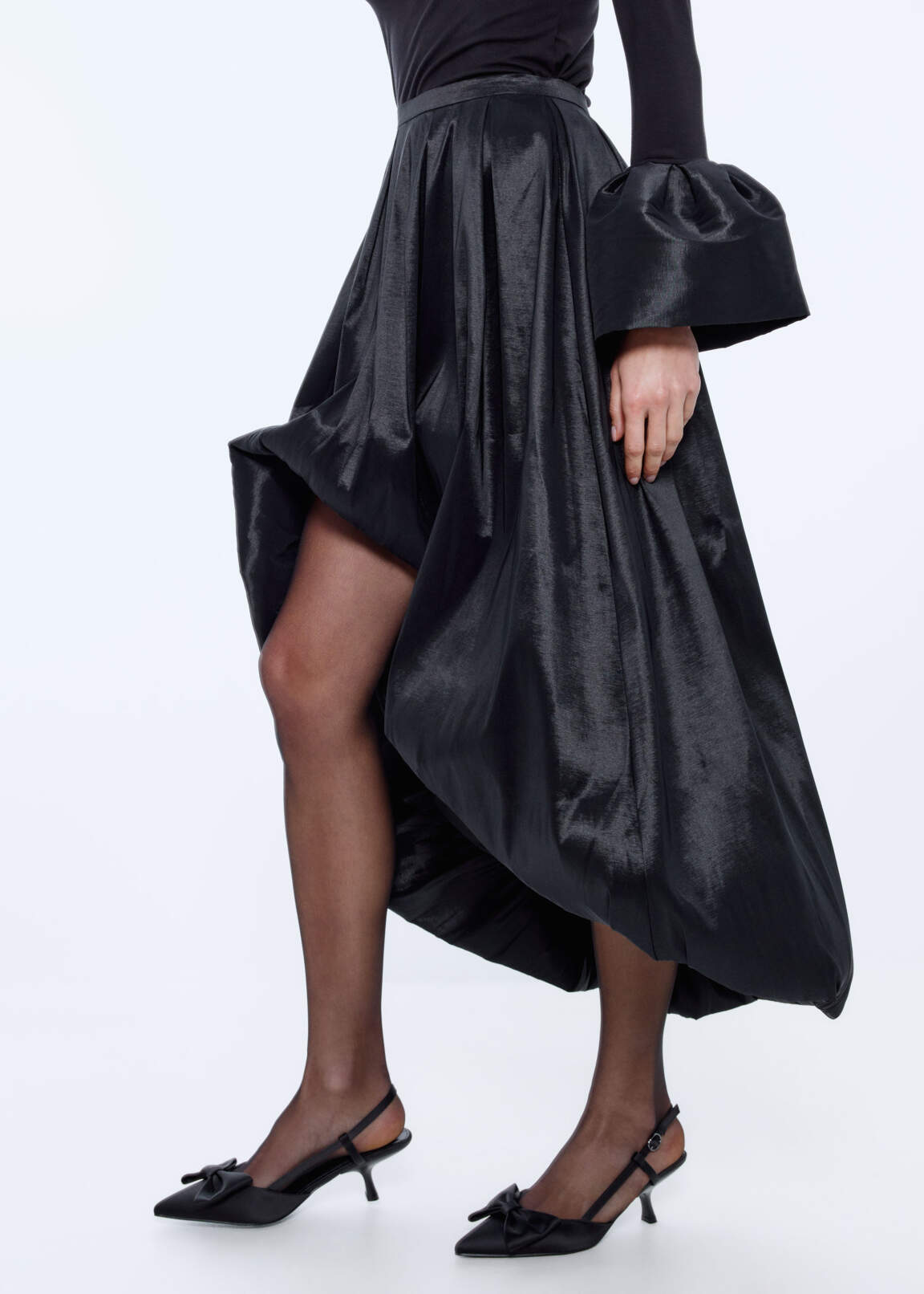 Юбка-баллон из фактурной тафты с лёгким блеском. Асимметричная длина, спереди длина до колена, по спинке — до щиколотки. Пояс с посадкой на талии, собранный на складки и деликатно расходящийся к низу. На спинке застёжка на потайную молнию.