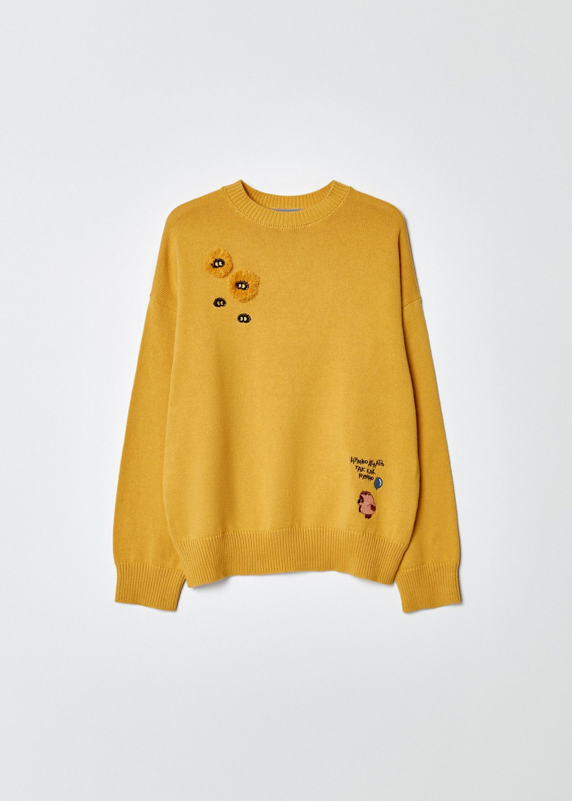 Вязаный джемпер оверсайз. Круглый вырез горловины и длинный рукав. Выполнен из плотного мягкого трикотажа на основе хлопка. Изделие декорировано тематическими вышивками.