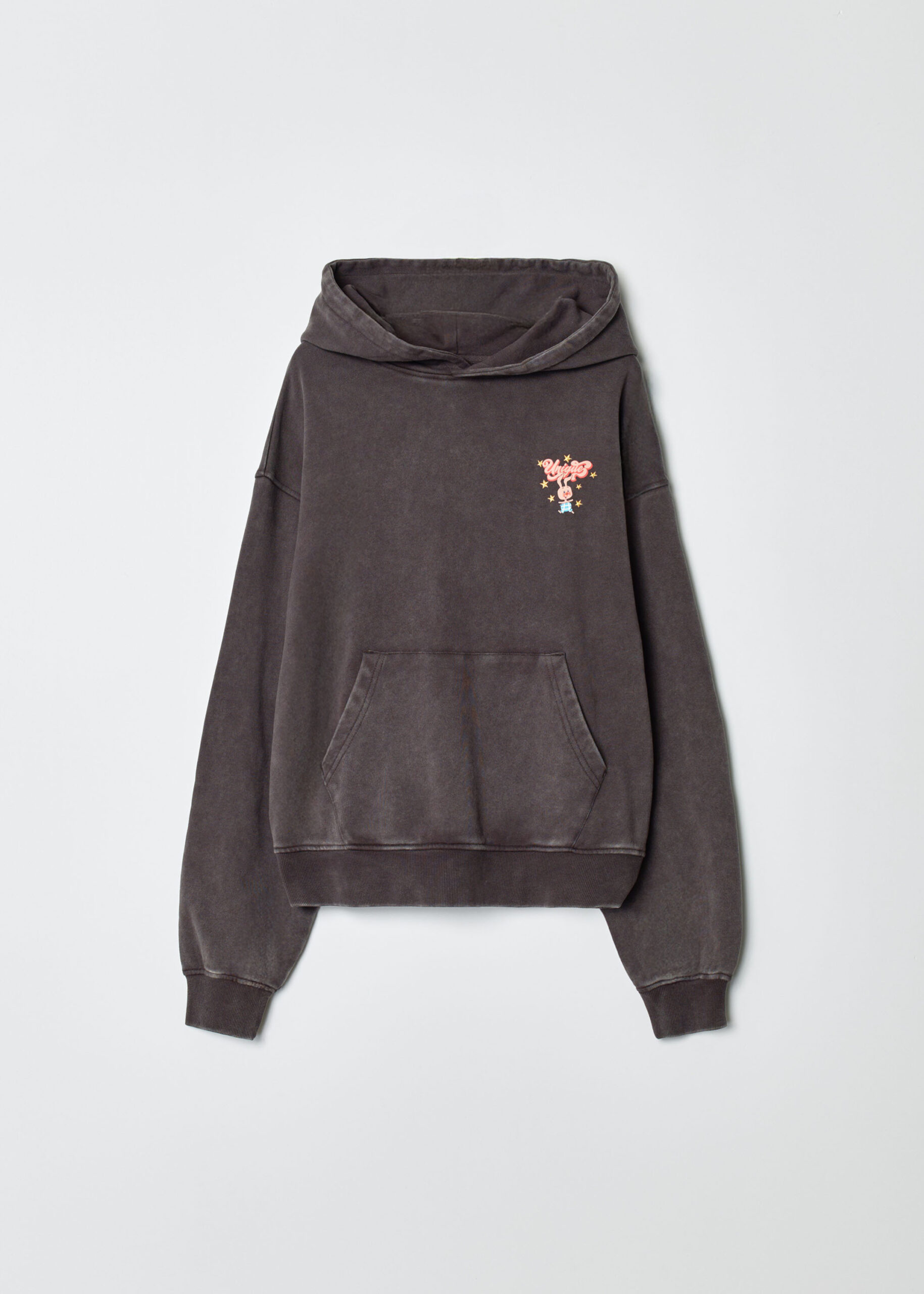 Худи с кислотной стиркой и небольшим тематическим принтом на груди. Мягкий хлопковый футер с лёгким начёсом на изнанке. Прямой крой со спущенным плечом. Капюшон, накладной карман кенгуру и длинный свободный рукав. Рельефная резинка на манжетах и по низу.