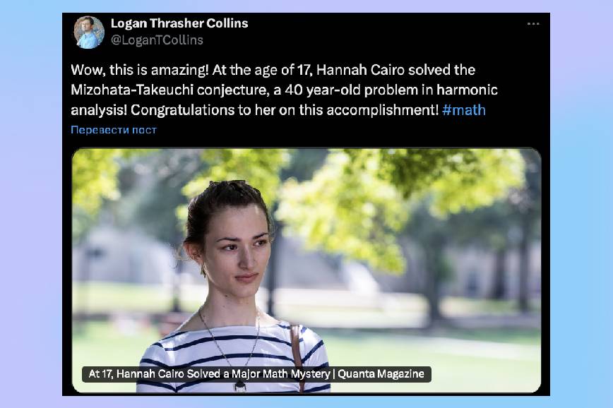 17-летняя Ханна Каиро из США математическую гипотезу Мидзохаты — Такеучи. Учёные безуспешно пытались её доказать на протяжении более 40 лет. Ханна же смогла решить задачу после того, как сначала занималась математикой самостоятельно, а потом присоединилась к математическим кружкам, на которых разбирались сложные задачи.