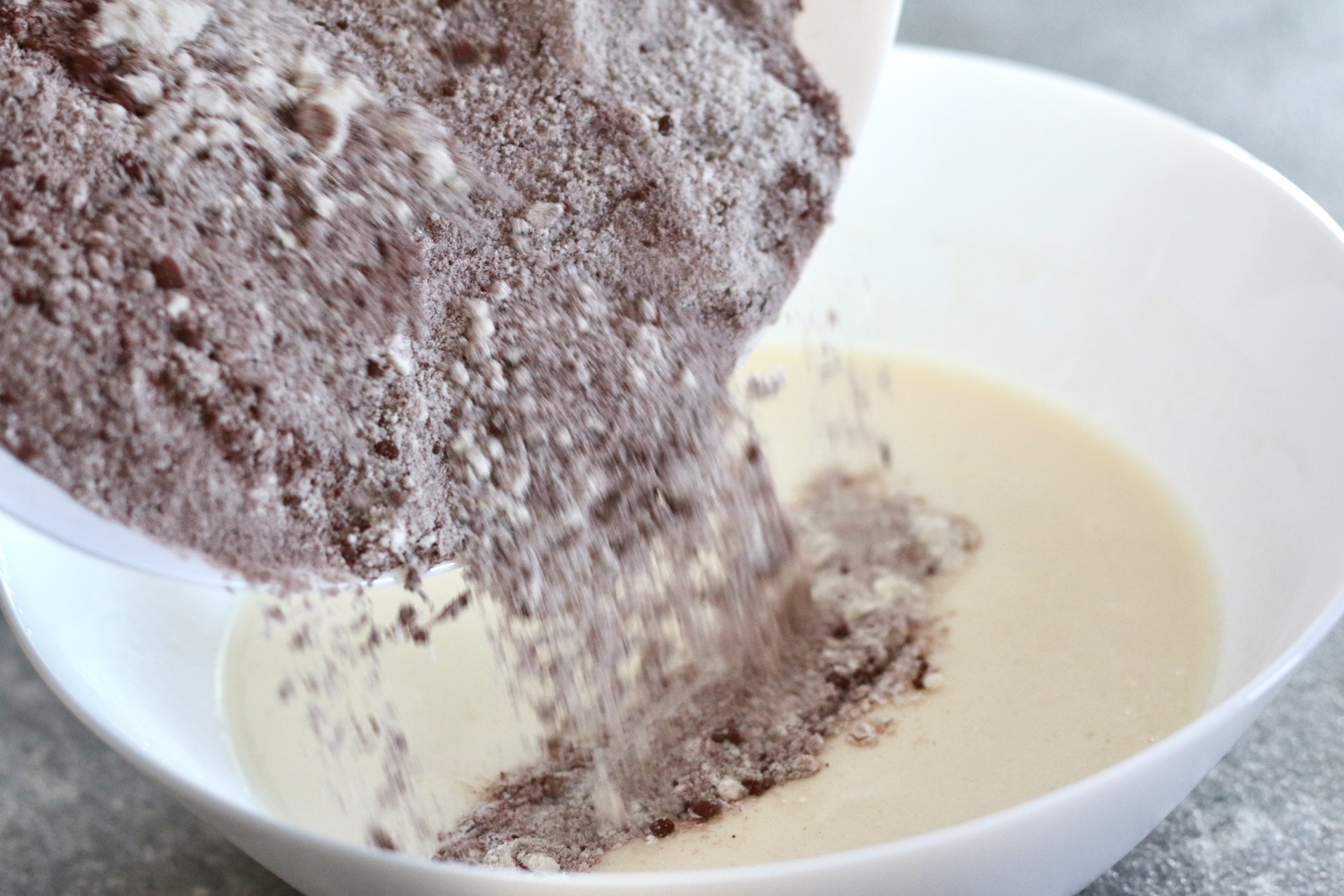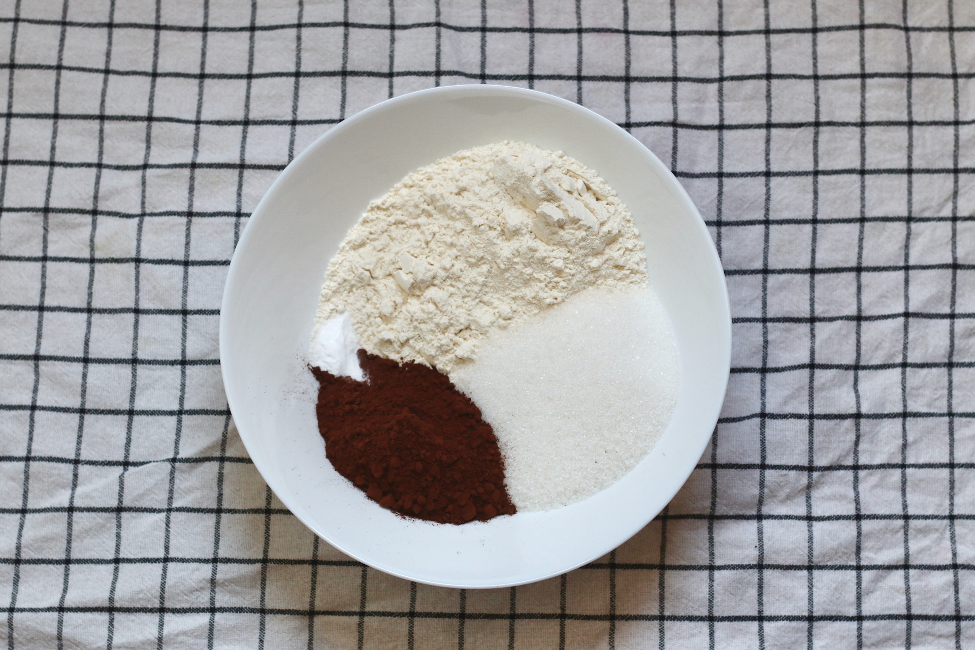 2. Смешайте все сухие ингредиенты: муку, сахар, какао-порошок и соду.