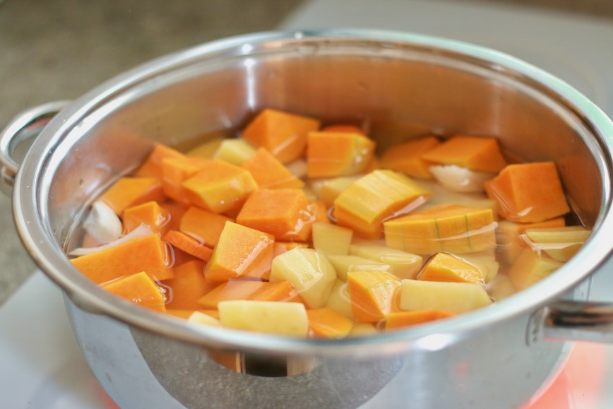 5. Добавьте соль и специи. Варите суп-пюре из тыквы на слабом огне около 30 минут, пока овощи не станут мягкими.