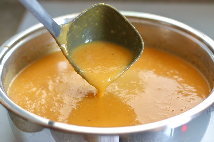 7. Тщательно измельчите суп-пюре из тыквы со сливками с помощью блендера. Если хотите добиться более нежной текстуры, дополнительно процедите суп через сито.