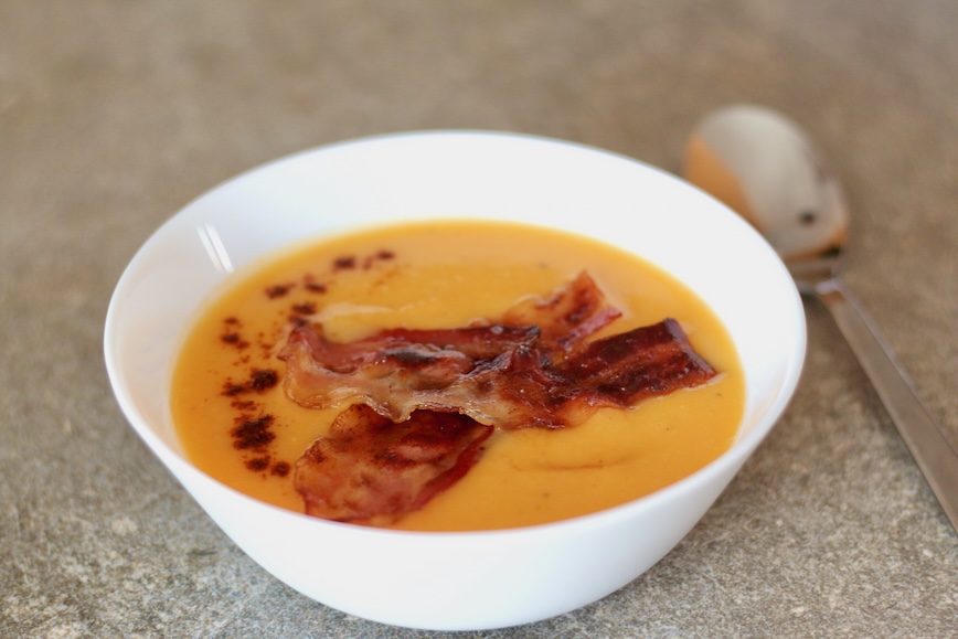 8. На сухой сковороде обжарьте бекон. Подавайте суп-пюре из тыквы с беконом.