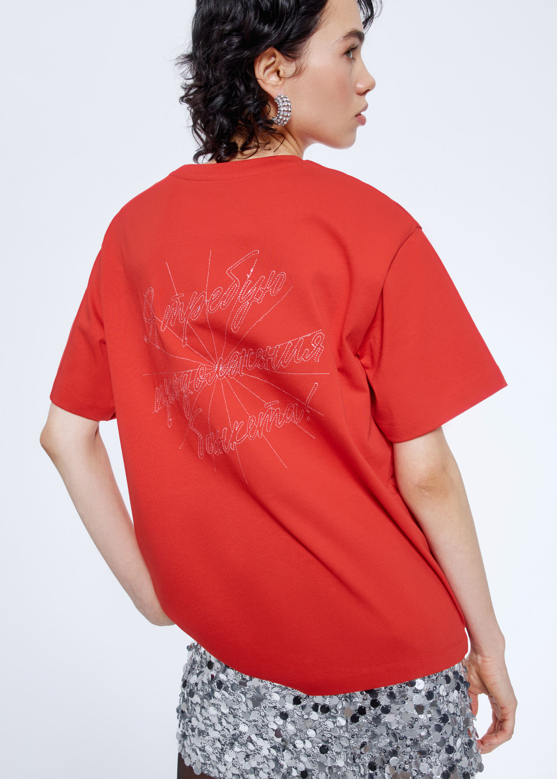 Футболка оверсайз из хлопка. Свободный крой со спущенным плечом. Круглый вырез горловины в рубчик. Короткий рукав. Тематический небольшой патч по переду и вышивка серебряными нитями на спинке по мотивам фильма «Иван Васильевич меняет профессию».