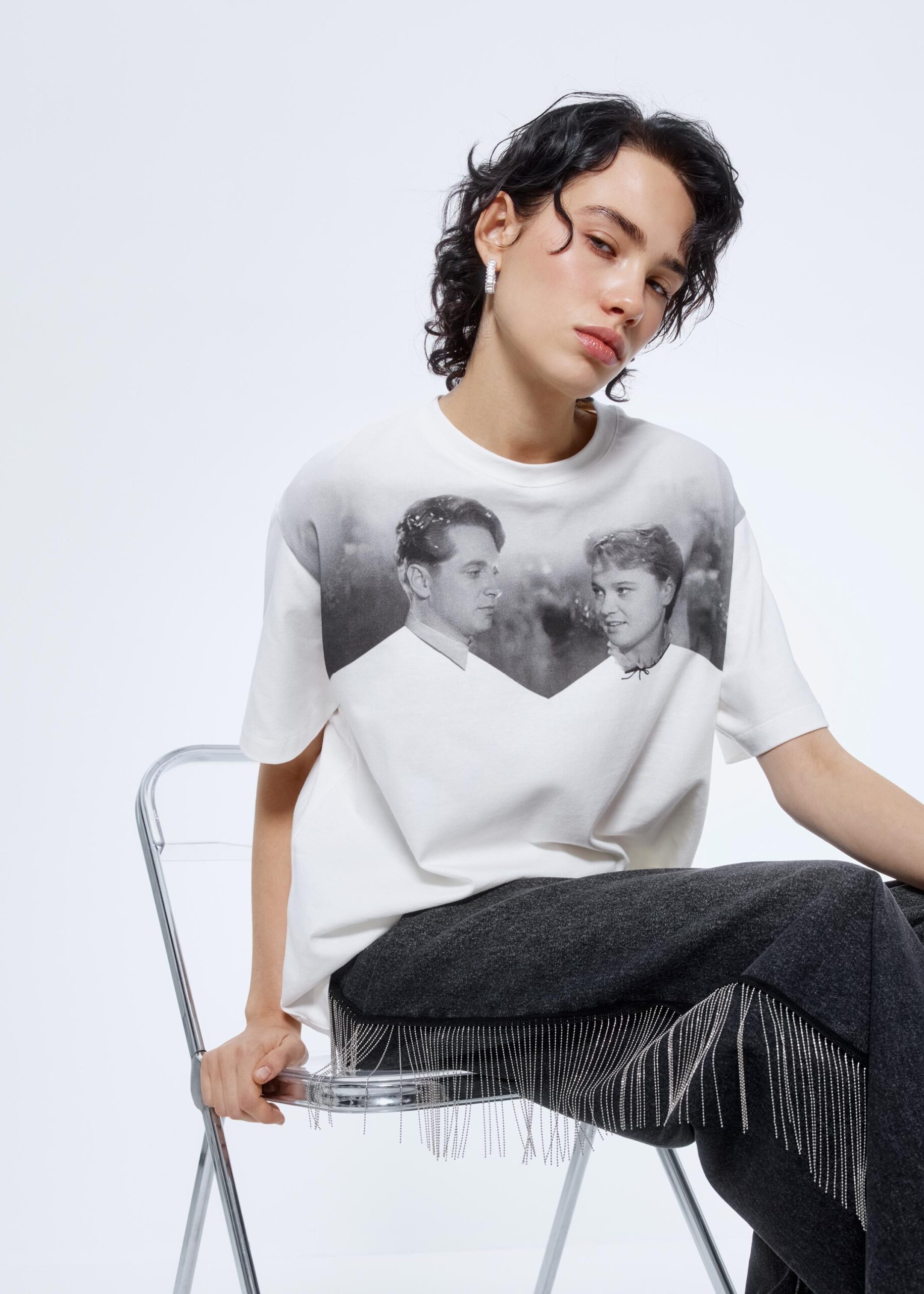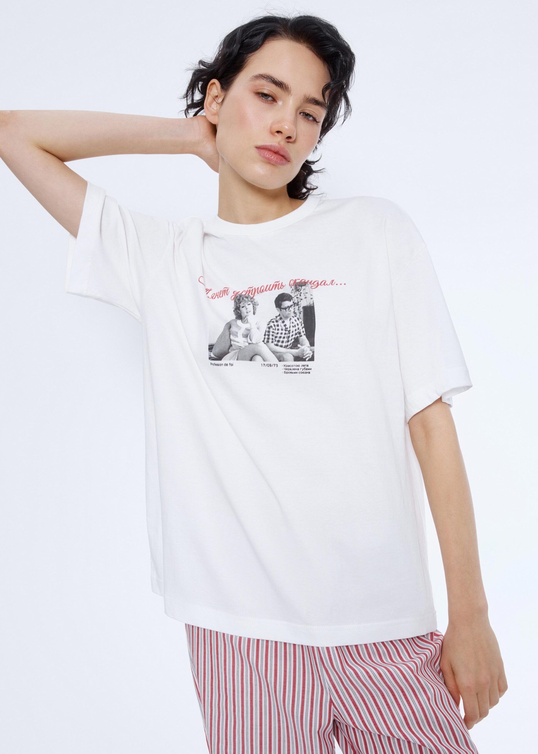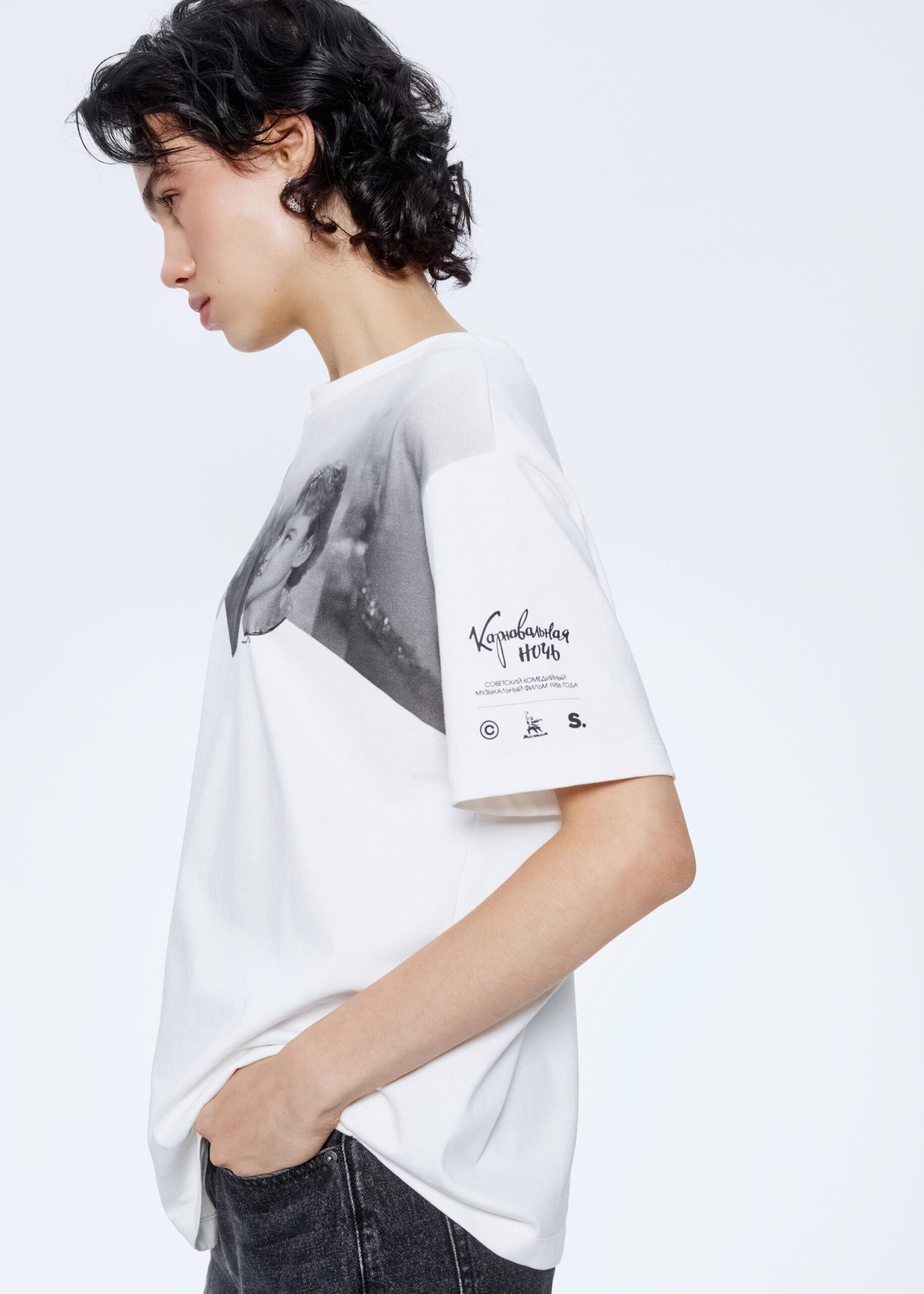Футболка оверсайз из хлопка. Свободный крой со спущенным плечом. Круглый вырез горловины в рубчик. Короткий рукав. Тематический большой принт по переду и небольшой принт на рукаве по мотивам фильма «Карнавальная ночь».