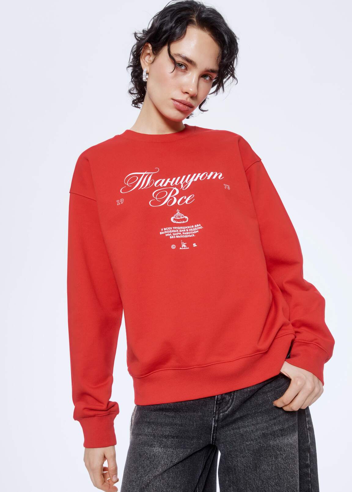 Свитшот выполнен из плотного футера с петельчатой изнанкой. Свободный крой со спущенным плечом. Круглый вырез горловины и длинный рукав. Горловина, манжеты и подол из риба. Яркий тематический принт по переду по мотивам фильма «Иван Васильевич меняет профессию».