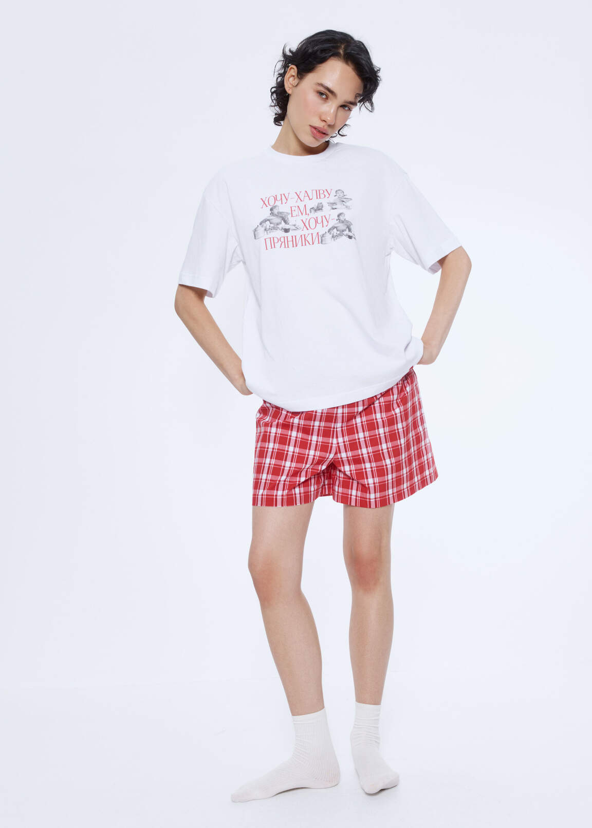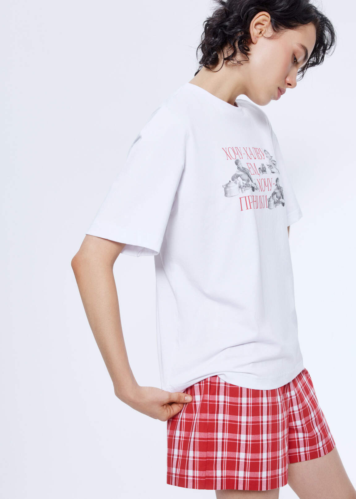 Пижама из футболки и шорт. Футболка свободного кроя. Шорты свободные из хлопковой ткани в клетку на поясе с мягкой резинкой. Тематический принт по мотивам кинофильма «Девчата».