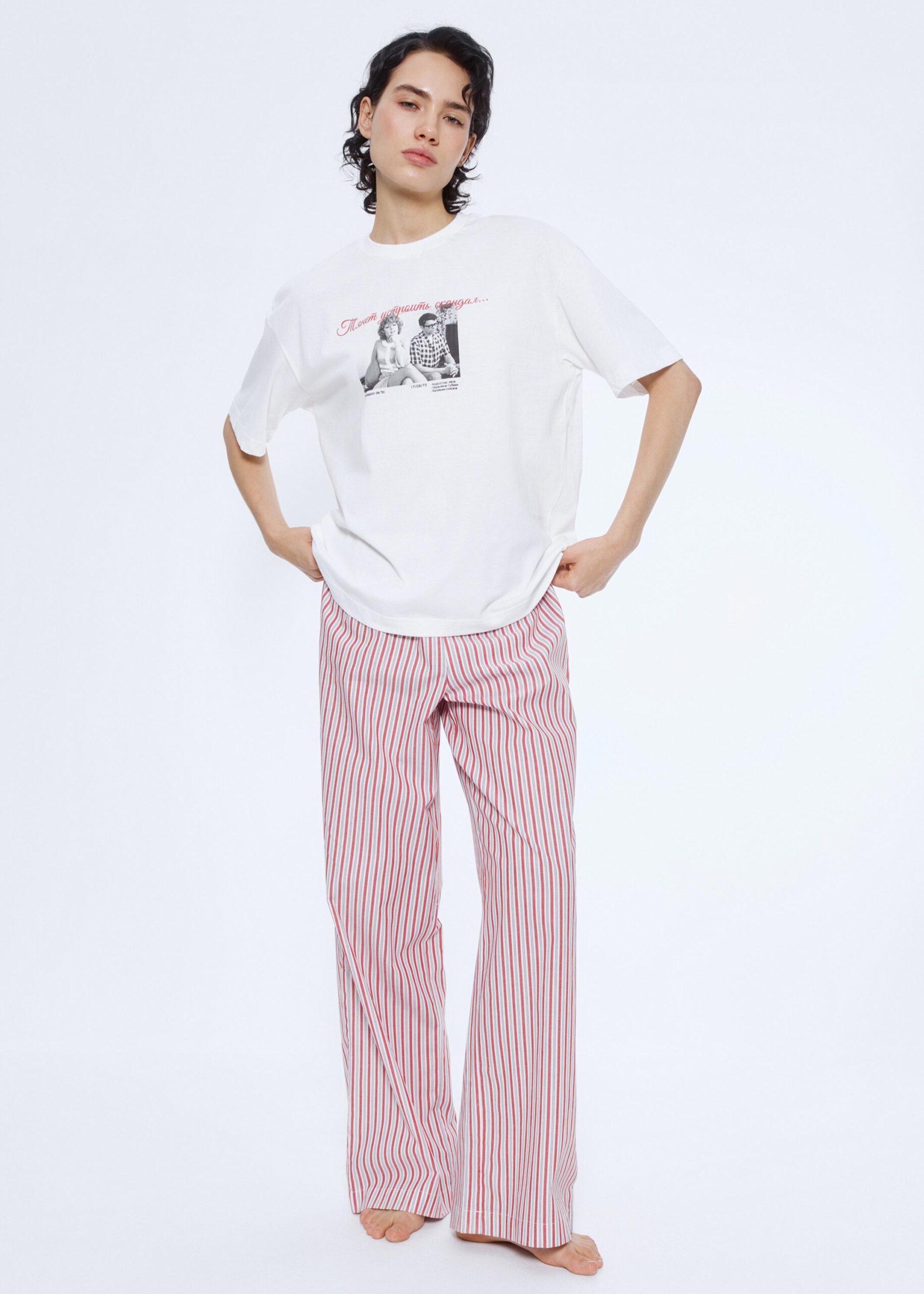 Пижама состоит из футболки и брюк. Футболка свободного кроя, брюки свободные из хлопковой ткани в полоску на поясе с мягкой резинкой. Тематический принт с цитатой из фильма «Иван Васильевич меняет профессию».