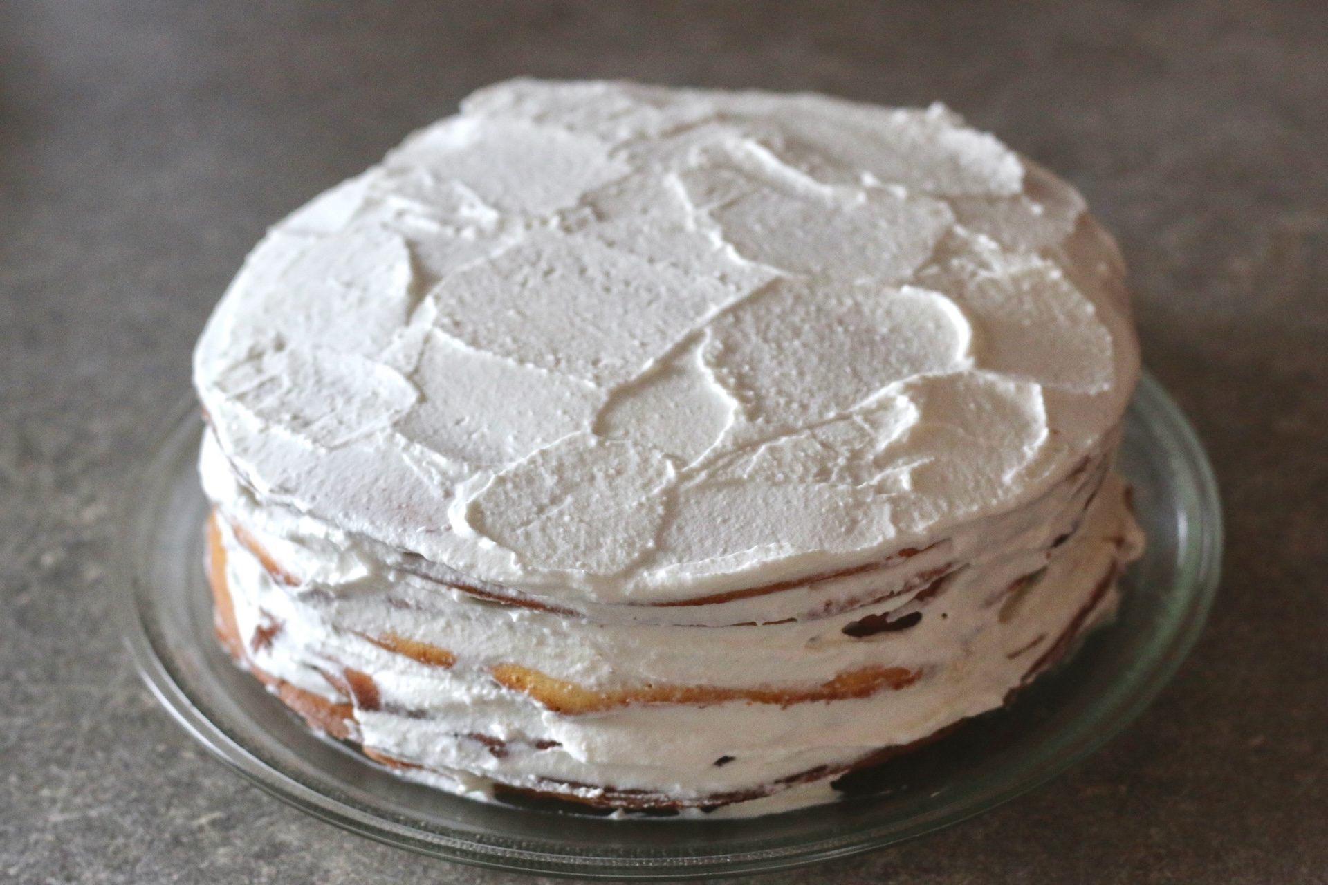 11. Оставшейся массой смажьте верх и бока торта «Молочная девочка». Накройте его и поставьте в холодильник на 8–10 часов для пропитки.
